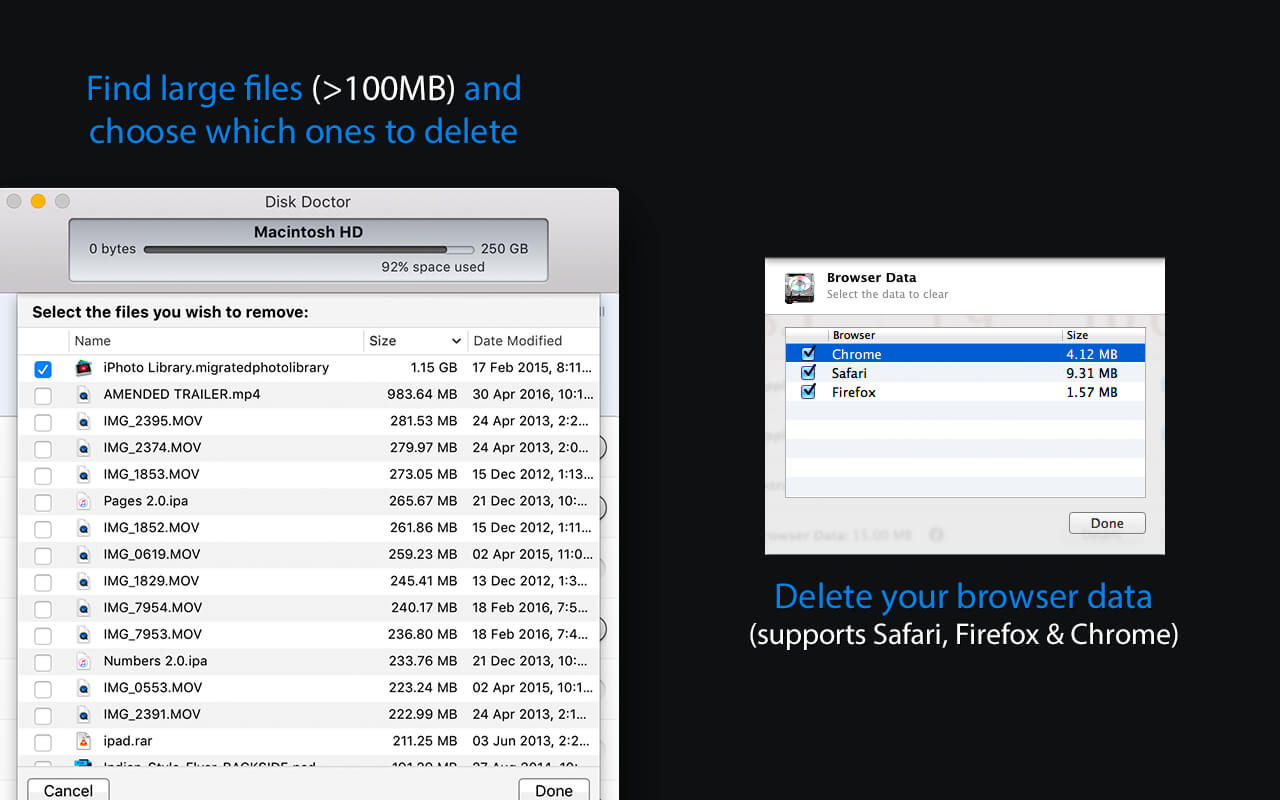 ApplicationApplicationsTools & Utilities Disk Doctor 4.6 February 13, 2026 ( Disk Doctor 4.6 )Loading... Download Free up tons of disk space with Disk Doctor by removing gigabytes of unneeded files from your hard drive. With just a few clicks, you can selectively remove files from the following categories: Applications Caches Application Logs Browser Data Mail Downloads Folder Downloads Folder Large Files (files within your user folder that are larger than 100 MB) Partial Downloads Developer Files Old iOS Software Updates Trash Can Compatibility: macOS 10.13 Mac App Store https://geo.itunes.apple.com/app/id455970963 Screenshots Name: Disk_Doctor_4.6_Mac-torrents.Net.dmg Size: 12 MB Files Disk_Doctor_4.6_Mac-torrents.Net.dmg[12 MB] Download Torrent Related Posts:Disk Doctor 4.5Disk Doctor Pro 1.0.25Disk Slimming -Disk Cleanup Pro 9.1.6X-Disk 1.0.6 Download DiskDoctor 0 comment TwitterRedditEmail mac torrent MacTorrent - Torrents in Mac. Free Apps, Games & Plugins. Apple Final Cut Pro & Logic Pro X, Adobe Photoshop, Microsoft Office, Pixel Film Studios, previous post Blackmagic Design DaVinci Resolve Studio 20.3.2 next post Geekbench AI 1.7.0