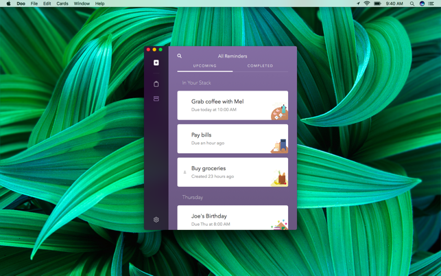 Doo helps you procrastinate less. Your reminders become cards that are easy to start and easy to finish. The streamlined edit screen encourages you to create tasks that can fit on a digital index card. Each card shows up in a stack — instead of a list — so you can focus on one thing at a time.