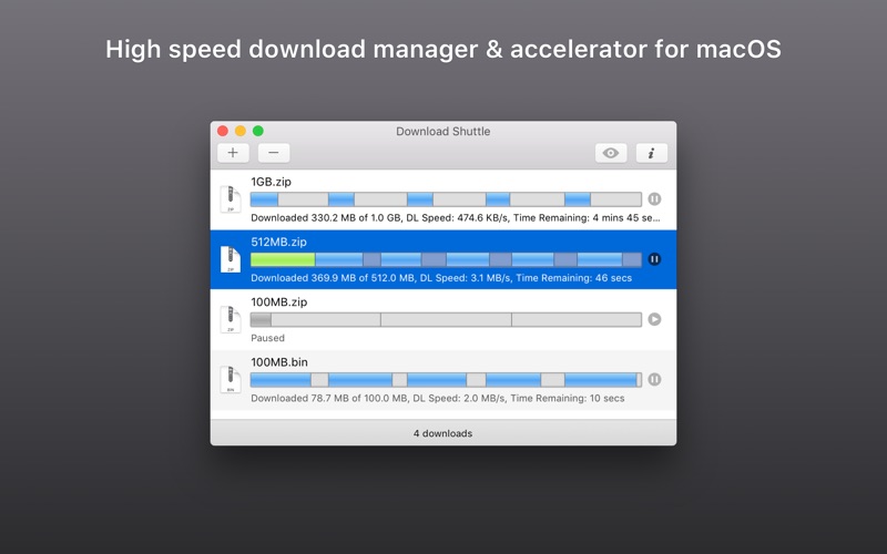 Download Shuttle is a blisteringly fast download accelerator and manager, and it’s free! All downloads made via Download Shuttle are multi-segmented, i.e., each file is split into many smaller parts that are simultaneously being downloaded. This ensures that the speeds you experience are a lot faster as your bandwidth is maximized.