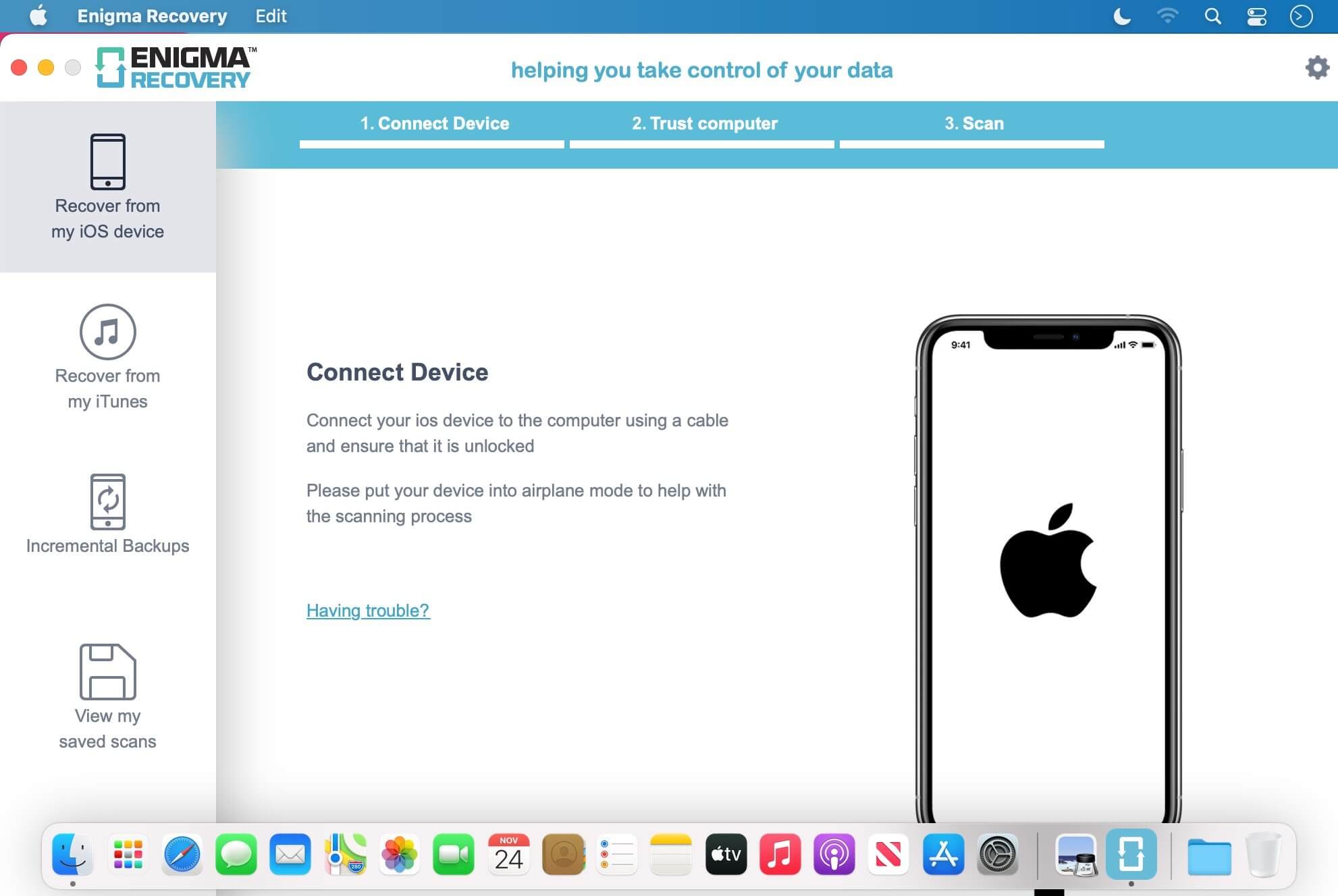 Enigma Recovery is designed to instantly recover deleted data from your iPhone, iPad, or iPod Touch, including SMS text messages, Contacts, Calendar, and Notes. Data can also be recovered from an iTunes backup file if your device has been lost or stolen. Additionally the scan retrieves deleted photos contained in the iOS ‘recently deleted’ folder.