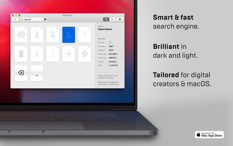 ApplicationsEntityGraphics & DesignPro Entity Pro 1.3.1 by mac torrent October 13, 2020 October 13, 2020 ( Entity Pro 1.3.1 )Loading... Download Entity Pro is the ultimate Unicode and Emoji Finder for macOS. Search smart, copy fast and learn digital typography. Features Smart & fast search engine Finds Unicodes, Hex, Decimal, HTML and Swift entities Helpful typography advice: Learn how to use your glyphs right Curated: Choose from over one hundred glyph collections Detail View: Inspect glyph metrics like ascender, descender and x-heights Collect your favourite characters Spotlight extension: Find your favourites super fast through macOS Spotlight Touchbar support for MacBook Pros Quick access to your frequently used characters Brilliant in dark and light Works 100 % offline Explore new glyphs by browsing through Entity Pros beautiful Card or List View—or use its powerful search to find Unicodes, Hex, Decimals, named HTML and Swift entities. On-point advice teaches you on how to use your glyphs in a typographically appropriate way. Tailored for designer, developer, authors and digital creators. Compatibility: OS X 10.14 or later, 64-bit processor Homepage https://apps.apple.com/app/entity-pro/id1503988785 Screenshots Name: Entity_Pro_1.3.1_MAS__HCiSO_Mactorrents.io.dmg Size: 9 MB Files Entity_Pro_1.3.1_MAS__HCiSO_Mactorrents.io.dmg[9 MB] Download Download 0 comment TwitterRedditEmail mac torrent MacTorrent - Torrents in Mac. Free Apps, Games & Plugins. Apple Final Cut Pro & Logic Pro X, Adobe Photoshop, Microsoft Office, Pixel Film Studios, previous post Airy Pro 3.19 (305) next post All Windows Appear 1.1.2