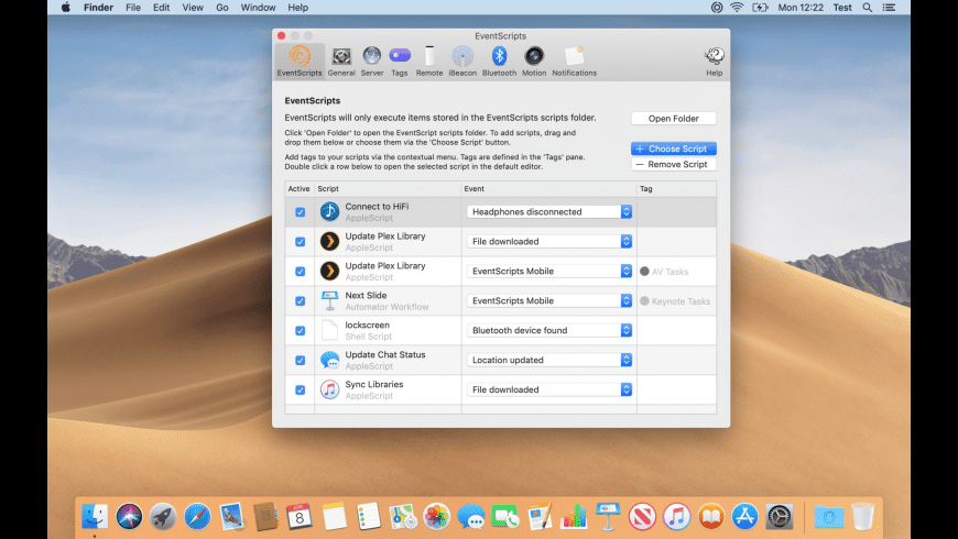 Scripts can be configured from the EventScripts pane of the preferences. In this pane you can: