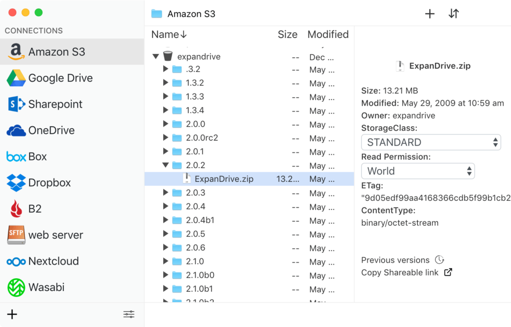 ExpanDrive creates a virtual drive for Mac and Windows that connects to all major cloud storage providers such as Dropbox, Google Drive, Google Team Drive, Amazon Drive, Box, OneDrive, Openstack Swift, BackBlaze B2, Amazon S3 or your own SFTP, FTP or WebDAV server and SMB/Windows File Sharing.