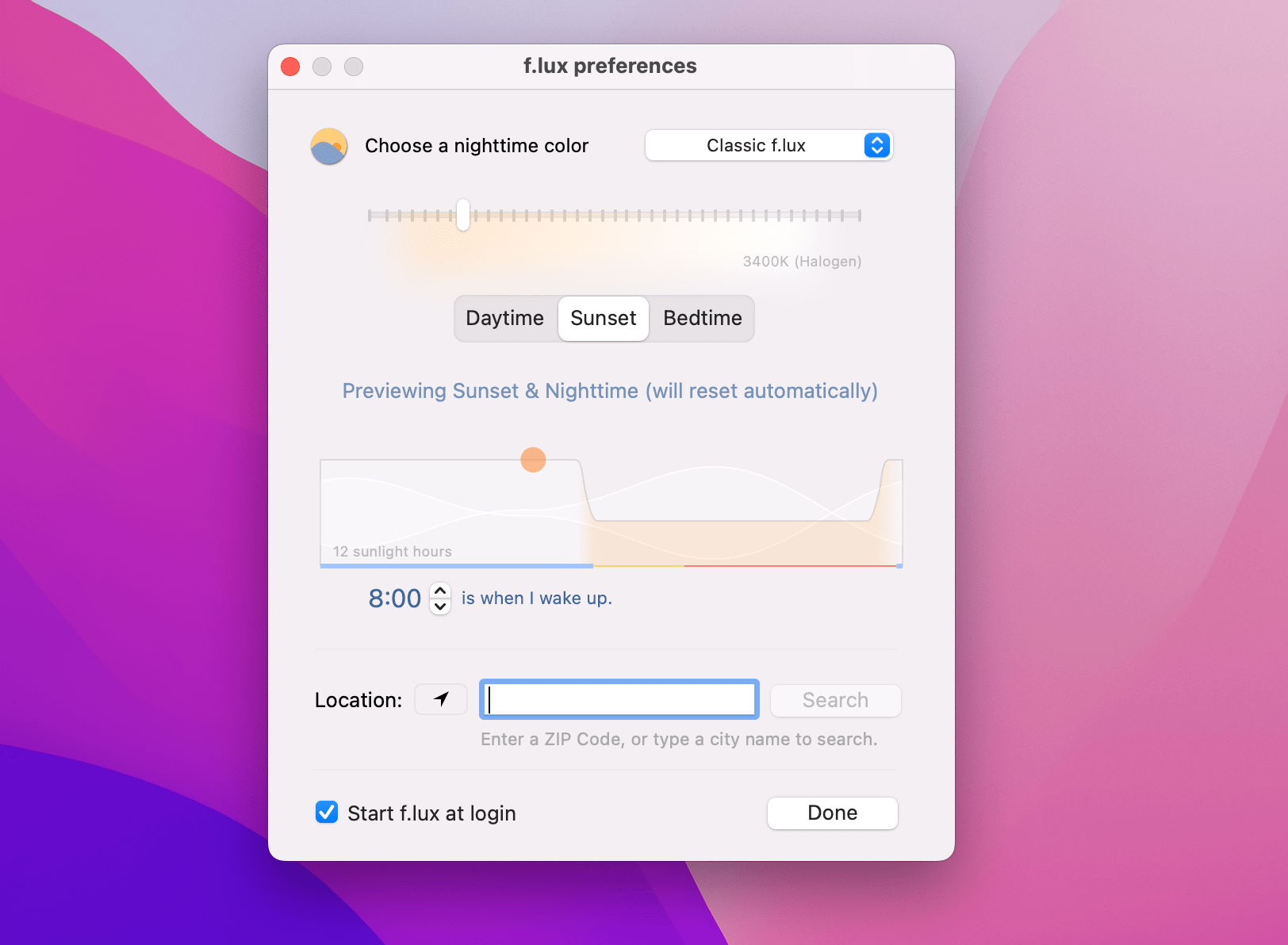 By accessing the Preferences window you can tell F.lux when you usually start your day and try different pre-defined colors for different scenarios. F.lux automatically switches between three light settings throughout the day.