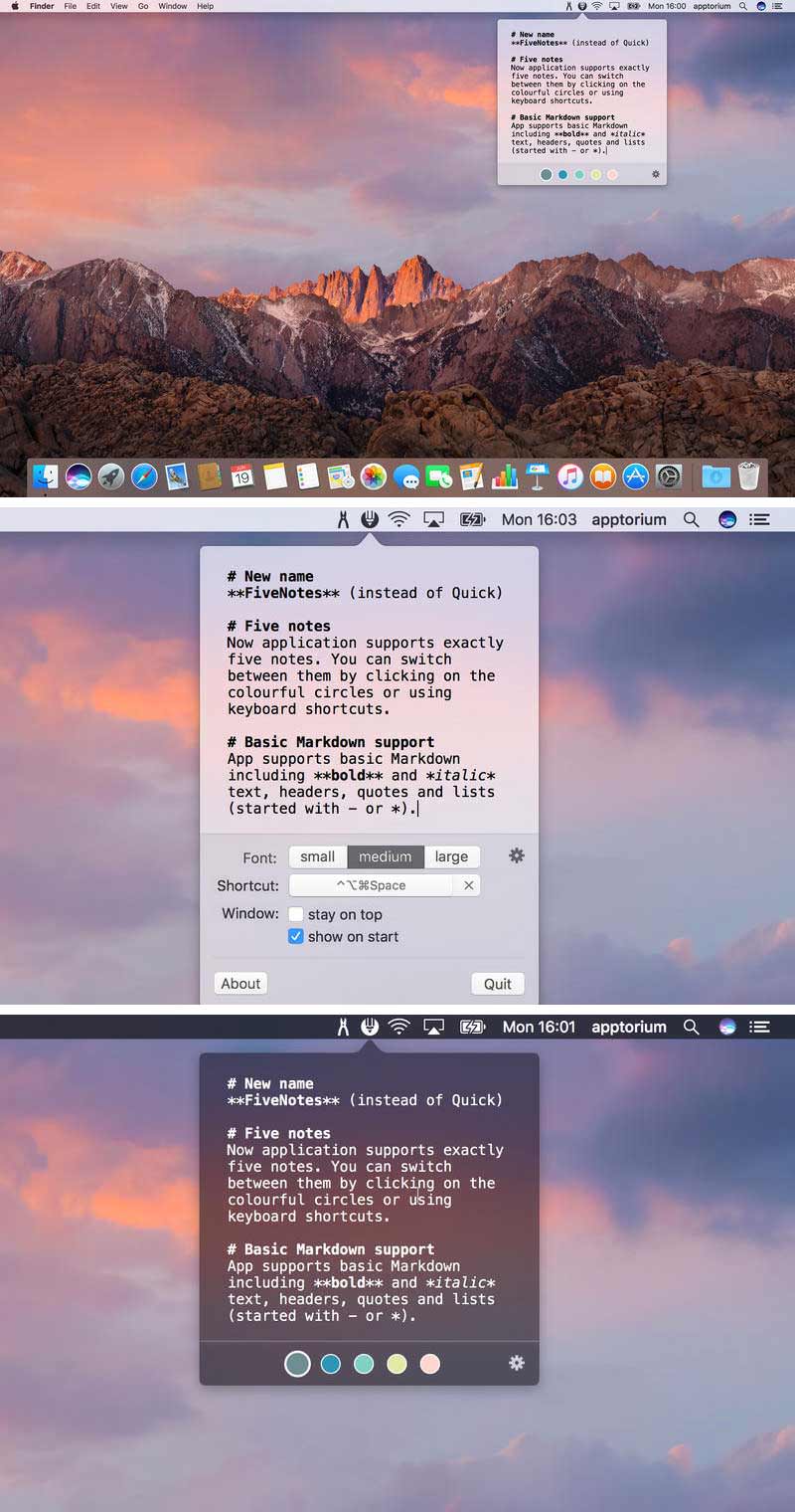 ApplicationsUtilities FiveNotes 2.3 by mac torrent July 6, 2022 July 6, 2022 ( FiveNotes 2.3 )Loading... Download FiveNotes (formerly known as Quick) is a small text editor that you can always access by clicking (or pressing shortcut keys) on its mtatus-bar icon, even if you’re working in a full-screen app. If you prefer, it can stay on top of the window so it can be used as a cheat-sheet app. FiveNotes offers exactly 5 notes that can be switched using colourful circles under the text area or by pressing shortcut (Cmd+Shift+[ and Cmd+Shift+] or Cmd+number-of-note). The application supports basic markdown formatting so your notes are clear. FiveNotes markdown includes headers, bold and italic text, quotes and lists (started with * or – character). It’s a great app for people who create small text files to write simple, temporary notes. You don’t have to worry about files, their names and saving them. What you write in FiveNotes remains there. If you need to write something quickly (for example a phone number) just open FiveNotes and write it. What’s New: Version 2.2 auto indention window height can be changed note color can be changed better Markdown support Compatibility: macOS 10.12 or later, 64-bit processor Homepage https://apps.apple.com/us/app/fivenotes/id1231597027 Screenshots Name: FiveNotes_2.3__HCiSO_Mactorrents.io.dmg Size: 11 MB Files FiveNotes_2.3__HCiSO_Mactorrents.io.dmg[11 MB] Download Related Posts:FiveNotes 3.2.0FiveNotes 3.1.3FiveNotes 3.1.4FiveNotes 3.0.3 Download 0 comment TwitterRedditEmail mac torrent MacTorrent - Torrents in Mac. Free Apps, Games & Plugins. Apple Final Cut Pro & Logic Pro X, Adobe Photoshop, Microsoft Office, Pixel Film Studios, previous post Vidmore Player 1.0.32 next post ScreenFocus 1.1