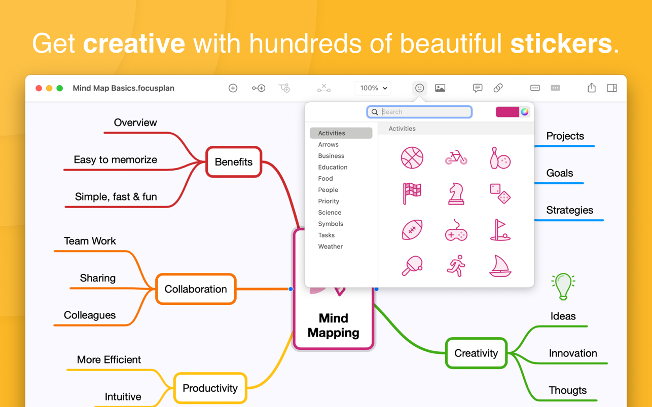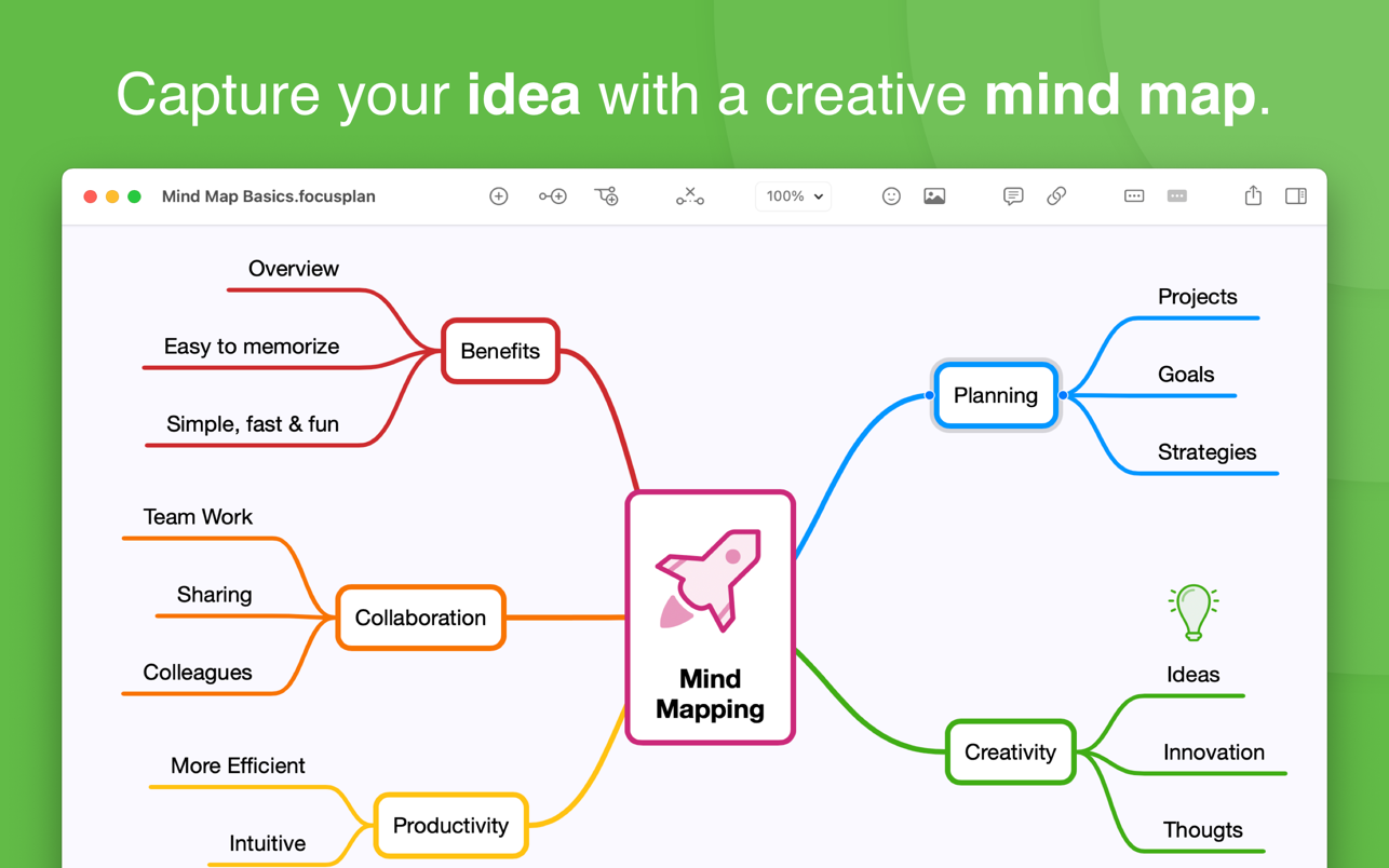 Focusplan is a powerful, full-featured, and flexible mind mapping and brainstorming app for everyone. It helps you capture, develop, and share your concept ideas, turning them into a stunning mind map.