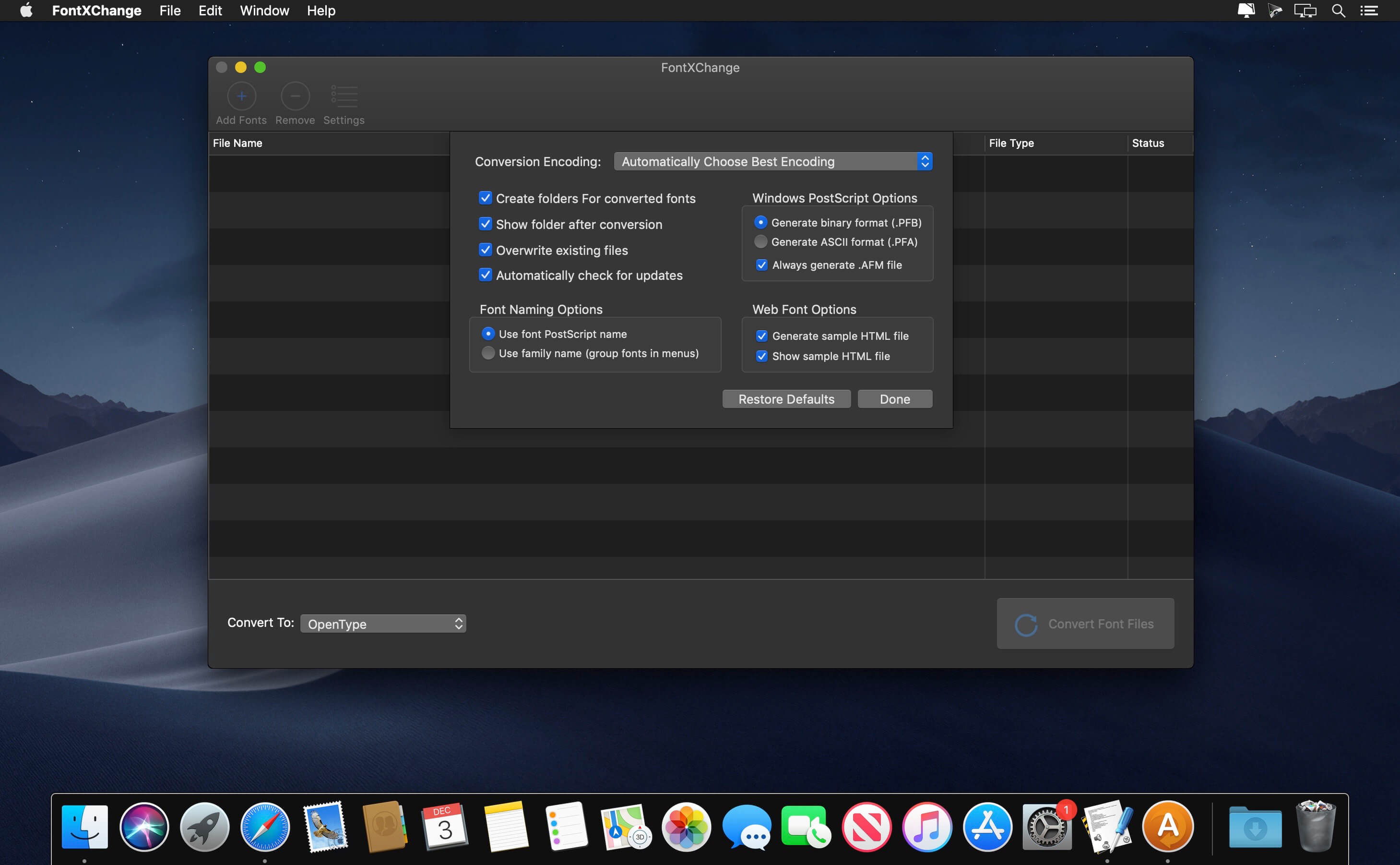 FontXChange can easily convert fonts to OpenType (PS), PostScript Type 1, and TrueType for both Mac or Windows. FontXChange is designed to understand many different font formats and can convert fonts into many different formats.
