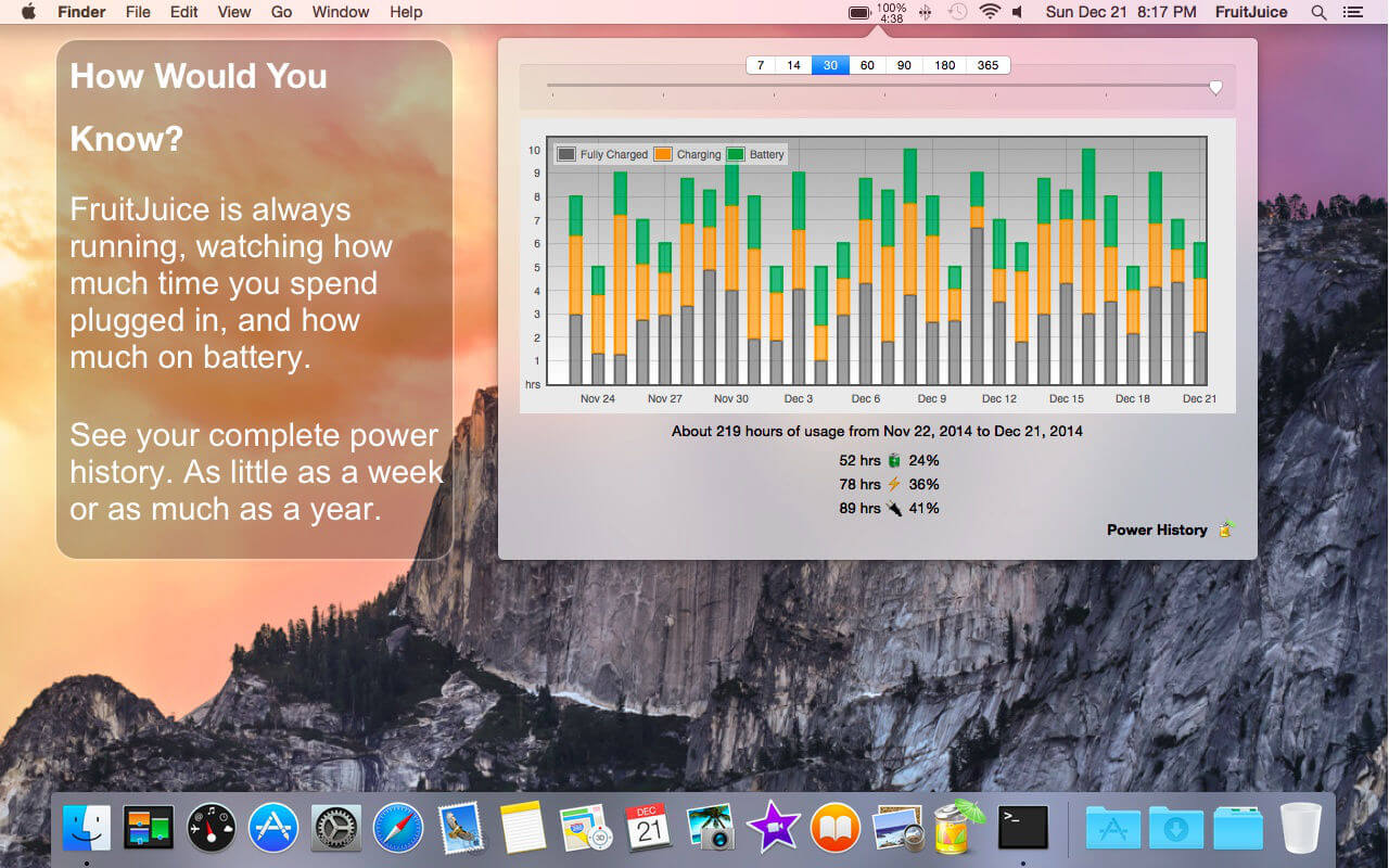 FruitJuice helps you achieve the longest runtime and lifespan from your Apple notebook battery.
