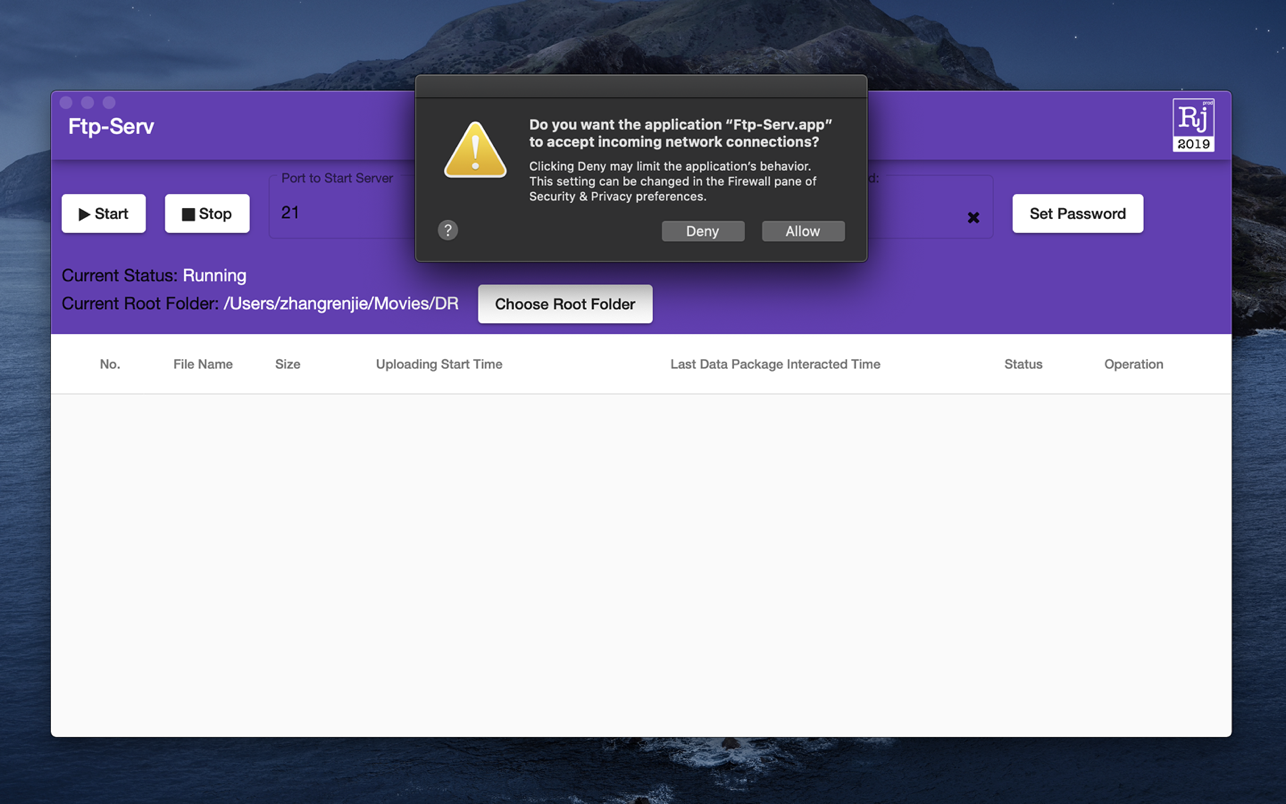 FYI, If you not clicked the ‘Allow’ button in the Network incoming alert dialog, never mind. You can allow the Network Incoming by this way: System Preference of your mac -> Security & Privacy -> Firewall -> Firewall Options -> Choose ‘Ftp-Serv’ and set to ‘Allow incoming connections’ -> then click the ‘Ok’ button.