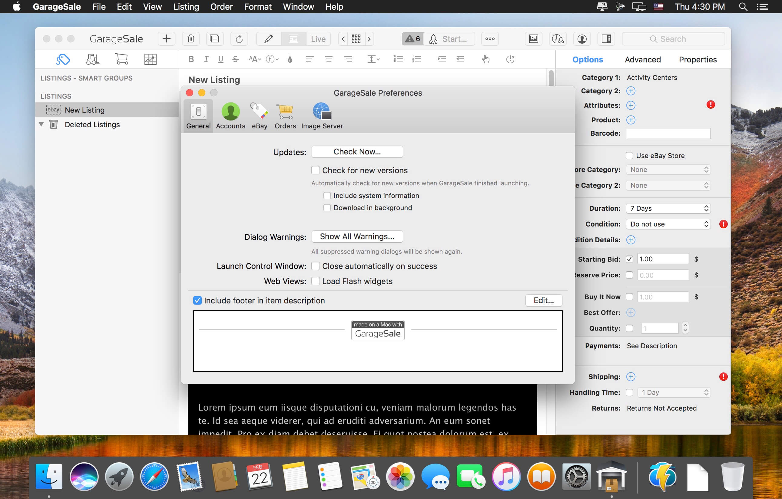 Create and manage your auctions with ease. With GarageSale, you can create, edit, track, and manage multiple auctions in a single, intuitive application. GarageSale even integrates with several international eBay sites, as well as with PayPal and Twitter, to provide a complete, robust eBay client.