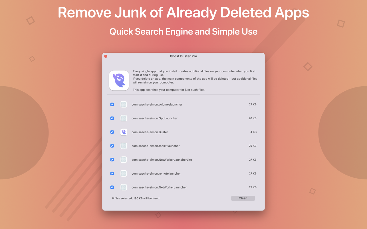 ApplicationApplicationsTools & Utilities Ghost Buster Pro 5.0.0 March 9, 2026 ( Ghost Buster Pro 5.0.0 )Loading... Download Ghost Buster Pro finds and deletes files from apps you’ve already uninstalled. The app is lightning fast and frees memory in no time. Many apps are installed on a computer, but they usually only stay on your computer for a short time. Each app creates files, but deleting the app does not remove them. This leads to a large number of files accumulating over time, which take up valuable storage space. Ghost Buster Pro searches your computer for exactly such files and can also delete them directly if you wish. Ghost Buster Pro offers the following features: Fast Search Ghost Buster Pro quickly scans your computer for data from previously deleted apps. You can have them deleted with one click. Extremely easy handling Ghost Buster Pro couldn’t be simpler. The search is started immediately after the app is started. You can now delete files with just one click. No automatic deletion Ghost Buster Pro does not delete any data without your consent. Choose for yourself which data is deleted and which you want to keep. Compatibility: macOS 15.0 or later Mac App Store https://apps.apple.com/app/app-ghost-buster/id1607749385 Screenshots Name: Ghost_Buster_Pro_5.0.0_Torrentmac.to.dmg Size: 7.29 MB Files Ghost_Buster_Pro_5.0.0_Torrentmac.to.dmg [7.29 MB] Download Torrent Related Posts:Ghost Buster Pro 2.5.1Ghost Buster Pro 2.5.0Ghost Buster Pro 2.4.1Ghost Buster Pro 2.4.0 Download 5.0.0BusterGhostPro 0 comment TwitterRedditEmail mac torrent MacTorrent - Torrents in Mac. Free Apps, Games & Plugins. Apple Final Cut Pro & Logic Pro X, Adobe Photoshop, Microsoft Office, Pixel Film Studios, previous post Native Instruments Massive X v1.7.1 next post Angry Birds Reloaded 3.25.1