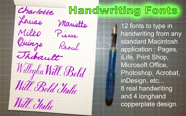 12 fonts created from real handwriting to produce documents that look and feel as if they had been written manually.