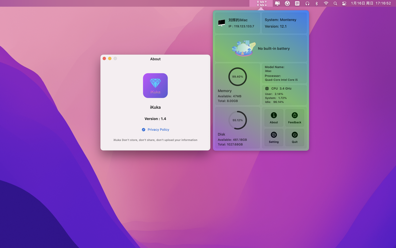 iKuka is a lightweight assistant application that can display your Mac’s network speed, battery, CPU, memory, IP and other information in real time.