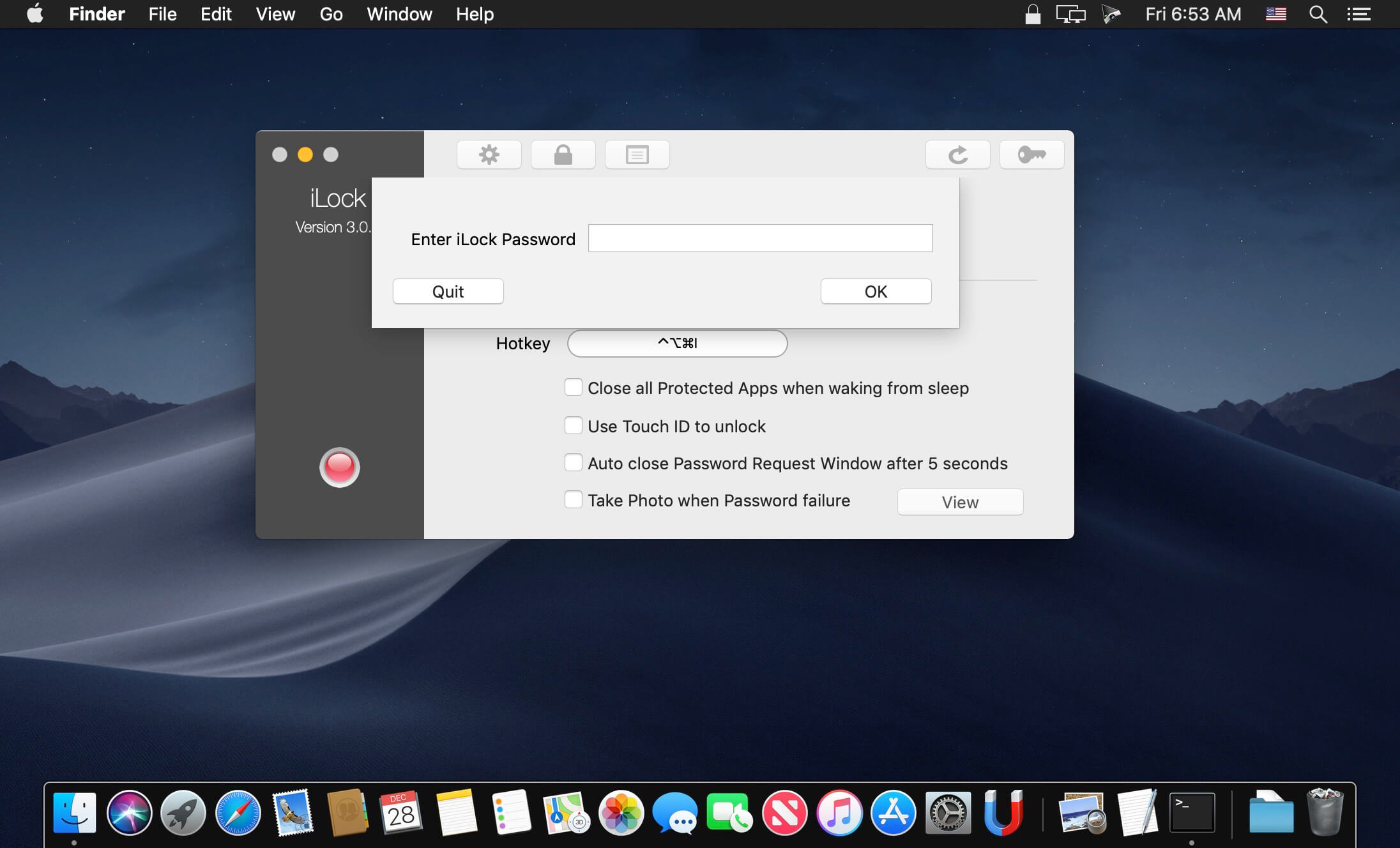 iLock password-protects any macOS application from unauthorized usage without modifying anything in your system settings and/or applications. It is safe to use!