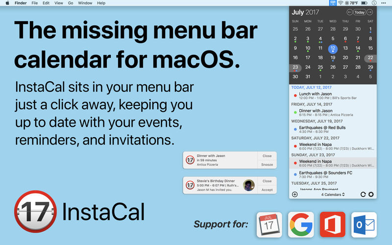 InstaCal is an affordable, yet powerful calendar app that puts all your events right at your fingertips, always available in your Mac’s menu bar. InstaCal is quick and convenient, and can be opened at any time with a configurable keyboard shortcut. From there you can view your calendar events, make changes, invite friends or even add new events. You can also see your Reminders list, and add new reminders as well as view and edit existing ones.