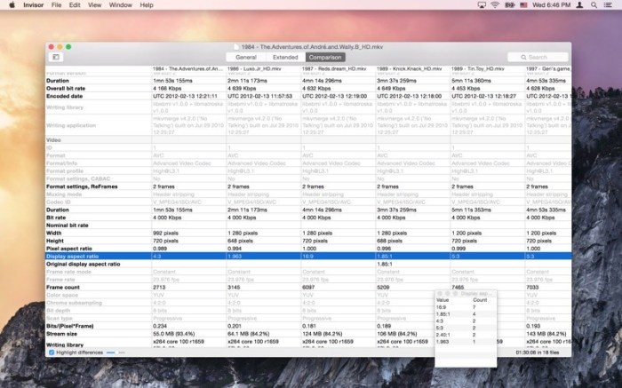 Invisor displays technical information about your video, audio and photo files with ability to compare collected data.