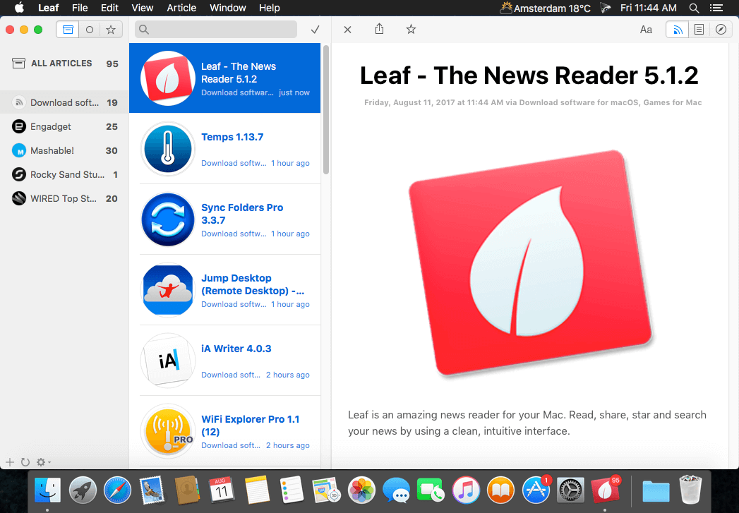 ApplicationsNews Leaf – RSS News Reader 5.2.3 by mac torrent April 17, 2024 April 17, 2024 ( Leaf – RSS News Reader 5.2.3 )Loading... Download Name: Leaf_5.2.3_Mactorrents.biz.dmg Size: 10 MB Files Leaf_5.2.3_Mactorrents.biz.dmg[10 MB] Download Torrent Link Download Leaf is an amazing news reader for your Mac. Read, share, star and search your news by using a clean, intuitive interface. Highlighted features Enhanced for Retina display Quick and clean article preview with a sharing button Hide articles and notifications for subscriptions Synchronized read and starring with Google Reader Alerts/banners for new articles and access to past alerts in Notification Center Fast search for articles by title, source and content Swipe to mark articles read/unread Secure and convenient OAuth2 authorization Custom refresh interval + pull-to-refresh Default RSS Reader capability Compatibility: macOS 10.11 or later Homepage https://geo.itunes.apple.com/app/id576338668 Screenshots Related Posts:Leaf – RSS News Reader 5.2.4News Headlines 4.2News Headlines 4.3Readit News: App for Reddit 3.0 Download 5.2.3LeafNewsReaderRSS 0 comment TwitterRedditEmail mac torrent MacTorrent - Torrents in Mac. Free Apps, Games & Plugins. Apple Final Cut Pro & Logic Pro X, Adobe Photoshop, Microsoft Office, Pixel Film Studios, previous post Batteries 2.2.9 next post Things 3.20.5