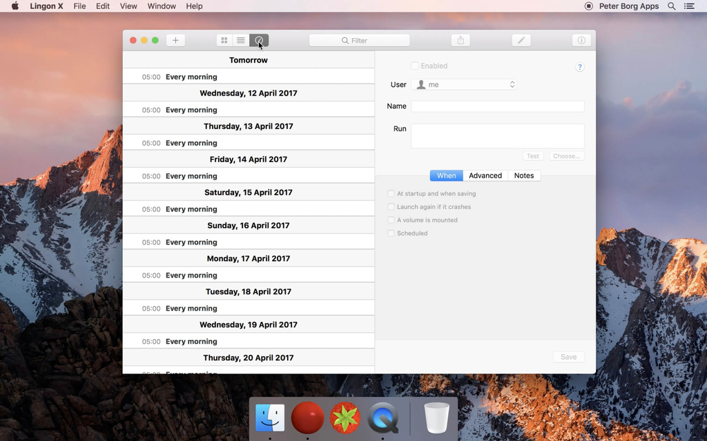 Lingon X 7 is based on the great Lingon 3 and extends it with new features like running jobs as root and at multiple dates. It is now even easier to use yet much more powerful. Version X 7 is a paid upgrade (a license bought today works with Lingon X 6 as well).
