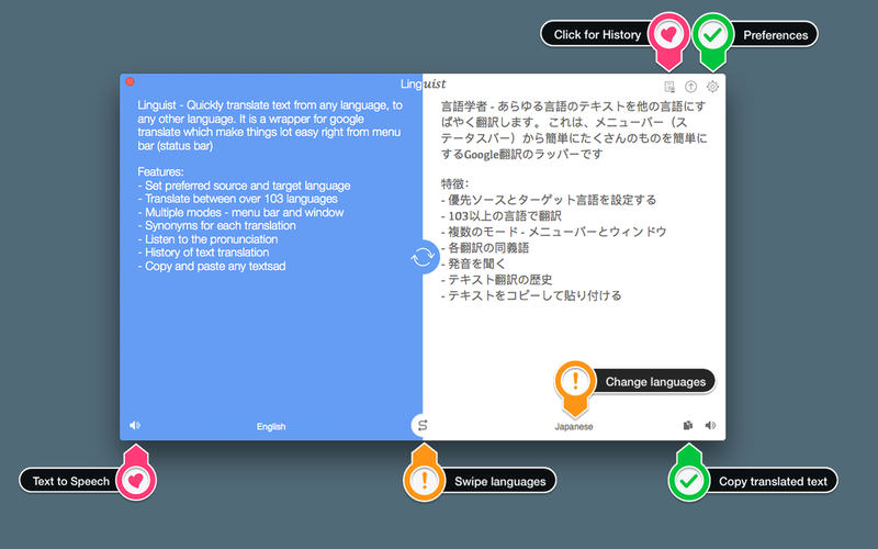 ApplicationsProductivity Linguist 2.5 by mac torrent February 10, 2022 February 10, 2022 ( Linguist 2.5 )Loading... Download Linguist is easy to use translation tool for quick translation from the menu bar (status bar) or window. Translation of words or phrases by selecting in any other app or website with just a click or command (HOTKEY). It can translate document in .txt, .rtf and .doc formats. Key Features: Set the preferred source and target language Translate between over 103 languages Translate document in .txt, .rtf and .doc formats. Automatically copy the translated text to the clipboard. Multiple modes – menu bar and window History of text translation for reference Export translated History in TextEdit(.txt) format HOTKEY to translate text from any website or App Synonyms for each translation Listen to the pronunciation Copy and paste the text. Compatibility: macOS 10.12 or later 64-bit Homepage https://apps.apple.com/us/app/linguiste-traducteur-linguistique/id1175751480 Screenshots Name: Linguist_2.5__TNT_Mactorrents.io.dmg Size: 5 MB Files Linguist_2.5__TNT_Mactorrents.io.dmg[5 MB] Download Related Posts:Linguist 3.0Linguist: Easy Translate App 3.2Linguist: Easy Translate App 3.3 Download 0 comment TwitterRedditEmail mac torrent MacTorrent - Torrents in Mac. Free Apps, Games & Plugins. Apple Final Cut Pro & Logic Pro X, Adobe Photoshop, Microsoft Office, Pixel Film Studios, previous post Movavi Screen Recorder 22.2.0 next post TransData 2.7