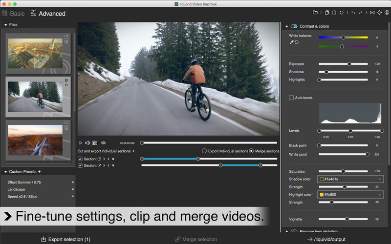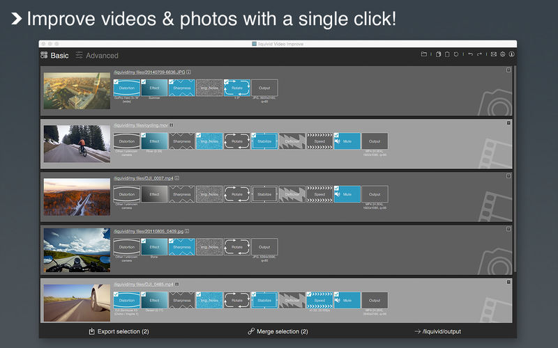 liquivid offers many appealing visual effects, fixes lens distortion caused by wide angle lenses (as in most actioncams), removes camera shake & image noise and improves colors and sharpness. Basic video cutting, batch processing and support for all common video formats, codecs and resolutions make it the tool of choice for everyone who wants to get more out of their captures.