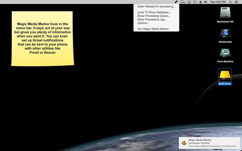 Magic Media Marker’s main purpose is to process video files and make them pretty in iTunes and on your Apple Devices. Feed Magic Media Marker a video file and it will automatically determine if the file is a TV Show or a Movie by it’s file name and download the appropriate metadata and artwork for you. Magic Media Marker is designed to be a “set it and forget it” kind of App needing no user interaction.