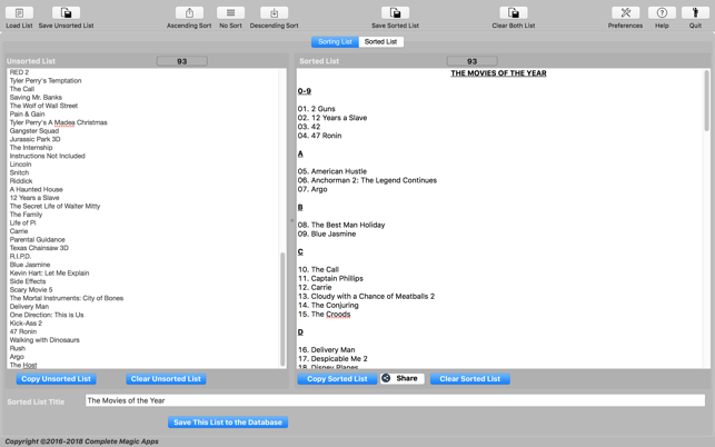 - Saving the Sorted Lists in the built-in database for future retrieval and re-sorting