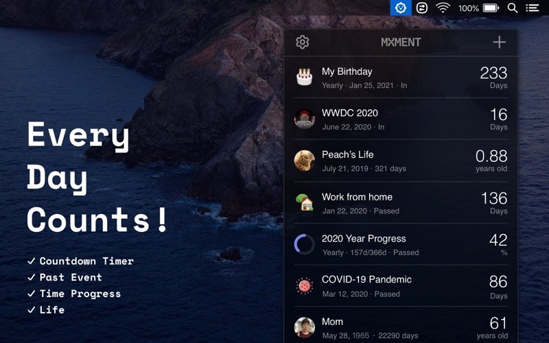 ApplicationsMomentUtilities Moment 1.1 by mac torrent September 4, 2020 September 4, 2020 ( Moment 1.1 )Loading... Download Moment is a Menu Bar and Notification Center based countdown app to help you remember the most memorable days of your life. Features Countdown and Past Event Create countdown events for all kinds of moment in your life: Birthday, Exam, Appointment, Wedding, Holiday, Events festival, Christmas, Your favorite game release day. Looking back on the memory of your special days: Graduation, Anniversaries, and the day you began work from home. Time Progress Know exactly how much time has been passed of the year, month, week and day, plan and manage your time based on Time Progress. Life Care about your age and the one you love, to remind you to spend more time with them. Customized Events Customize with emojis or your own photos to make your events personalized and emotional. Count down yearly, monthly, weekly, or daily to your events, then you will never be forgotten again. You can choose how early to remind you when the events getting close. Menu Bar and Today Widget Every single event can be added to the menu bar as an individual menu item. Take a peek of your events at Notification Center today widget, without even opening the app. Compatibility: macOS 10.14 or later 64-bit Homepage https://fireball.studio/moment Screenshots Name: Moment_1.1__TNT_Mactorrents.io.dmg Size: 12 MB Files Moment_1.1__TNT_Mactorrents.io.dmg[12 MB] Download Related Posts:Moment PRO 1.4 Download 0 comment TwitterRedditEmail mac torrent MacTorrent - Torrents in Mac. Free Apps, Games & Plugins. Apple Final Cut Pro & Logic Pro X, Adobe Photoshop, Microsoft Office, Pixel Film Studios, previous post Grids for Instagram 6.1.4 next post Perfectly Clear Complete 3.10.0.1828
