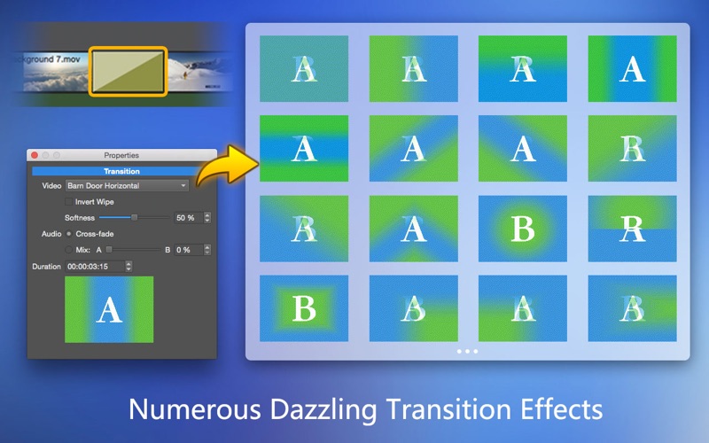 - 20+ dazzling transitions: Dissolve, Iris Circle, Clock Top, Cut, Bar Vertical…