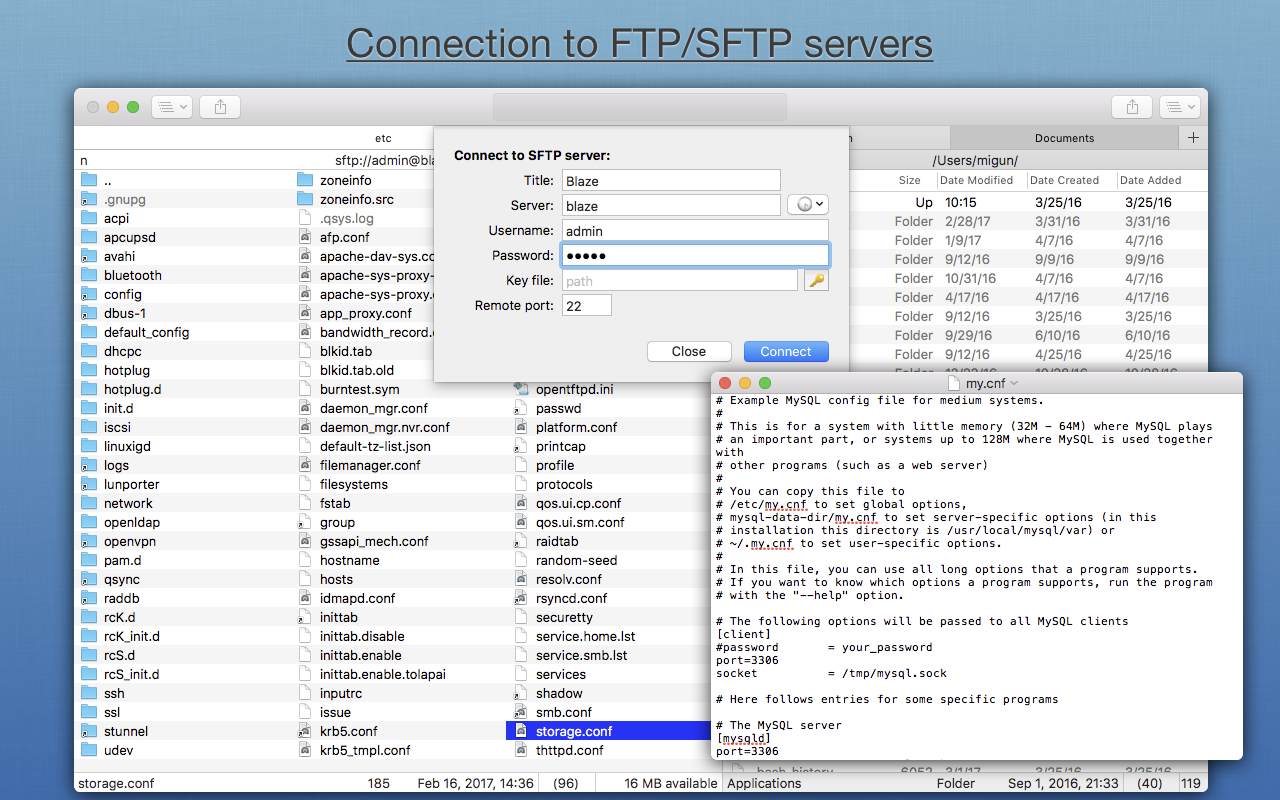 • Ability to connect to remote FTP, SFTP and WebDAV servers, Dropbox service, including remote files editing.