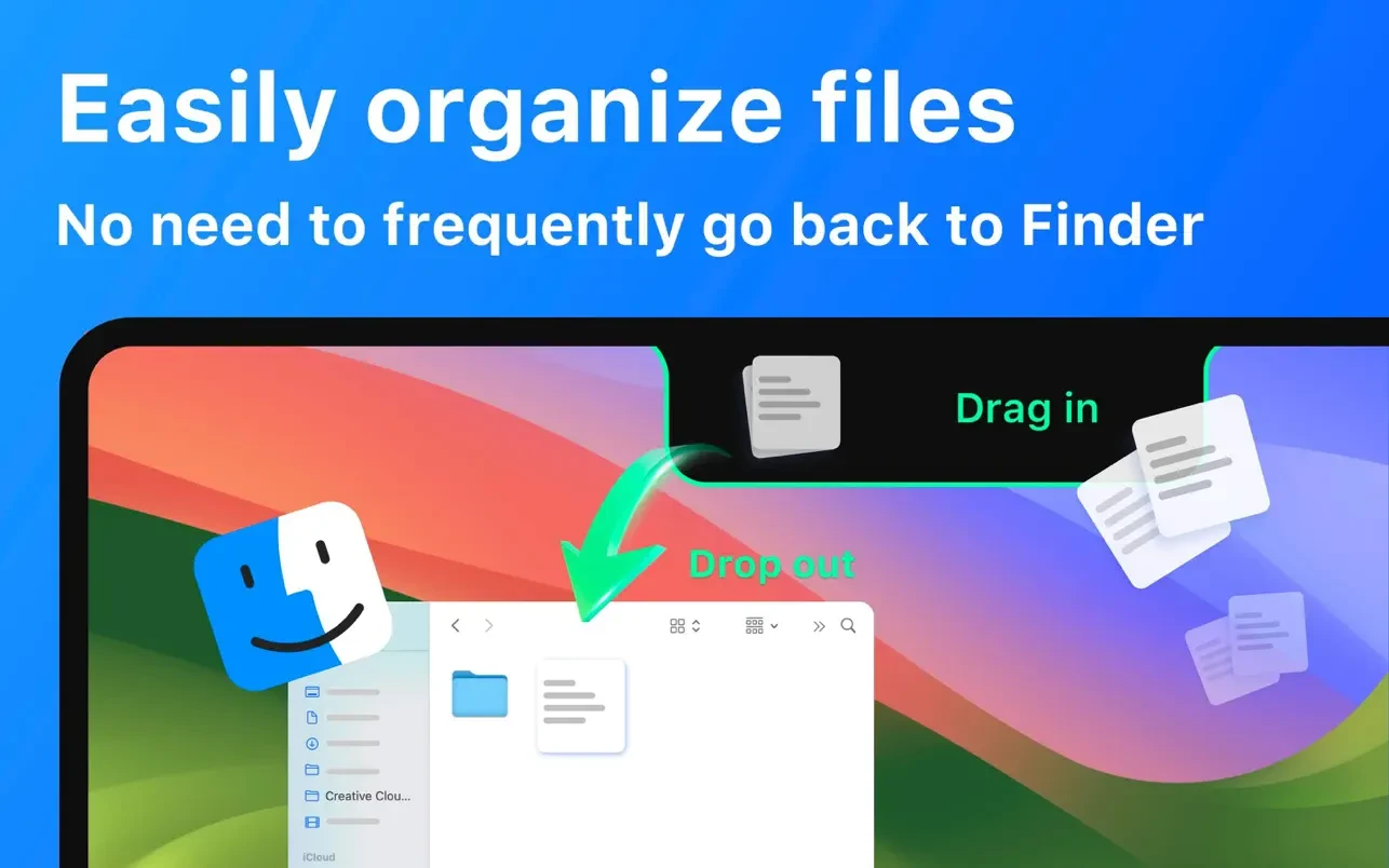 It’s also your temporary file shelf — just drag files in for quick access, and pull them out when you’re ready, making it perfect for quick file sorting and keeping your workspace clean and efficient.