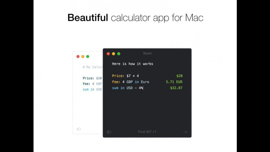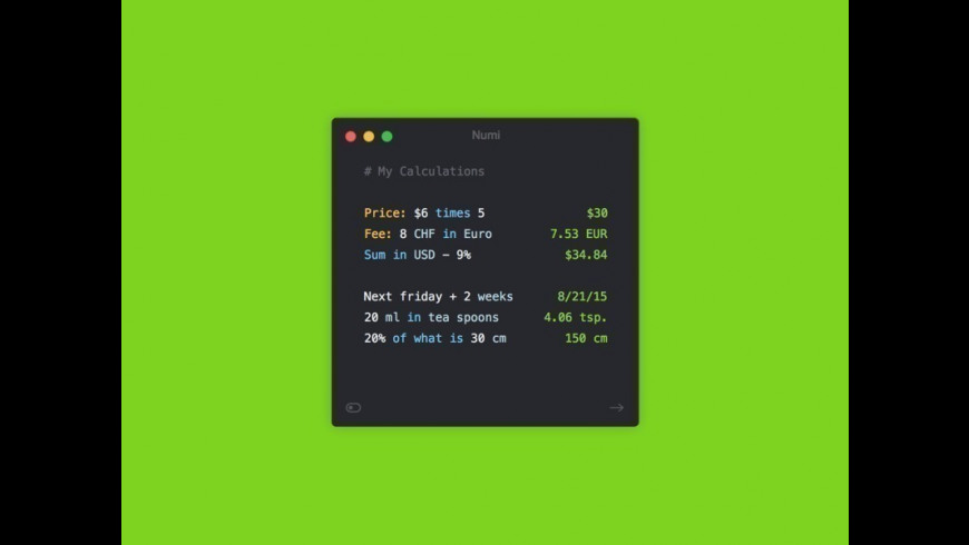 - Unit converter: Numi supports currency, length, area, volume, time, temperature, and data size. It automatically convert units if it’s needed.