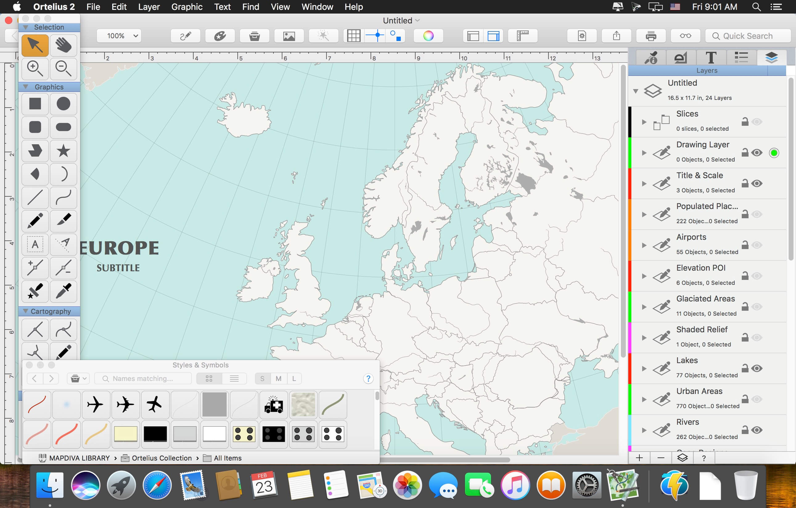 Ortelius is a full-featured vector drawing application especially for map design. Draw directly with features such as roads, rivers, coastlines, buildings, symbols and contours. Ortelius is known for its unique “connectable tracks” and expert stacked styles that make drawing tedious map features easy. Every object supports attribute data that can be referenced by text labels, and everything can be directly drawn and positioned simply by dragging and dropping. Though Ortelius is emphatically not a GIS, it does have limited support for importing shapefiles (refer to documentation for best results; re-projection is not supported). Powerful and extensive text features give you a fine degree of control over labelling. Create your own styles and symbols or use any of the many hundreds built-in. Layers and layer groups keep your work organized.