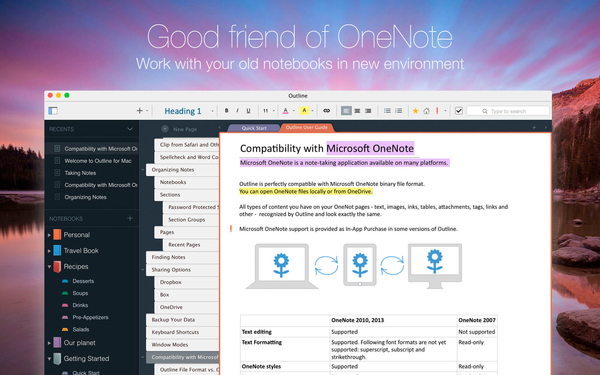 • Go beyond import/export and do a real time collaboration on notes with colleagues who use OneNote (your Mac and their PCs)