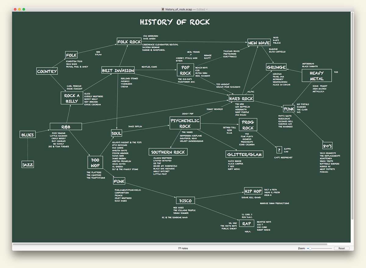 In short, then, Scapple is a tool for getting early ideas down as quickly as possible and making connections between them. The main advantage of doing this in Scapple instead of on paper is that you don’t run out of paper (the Scapple canvas expands to fit as many notes as you want to create), you can move notes around to make room for new ideas and connections, it’s easy to delete and edit notes, and it’s easy to export your notes into other applications when you know what you want to do with them.