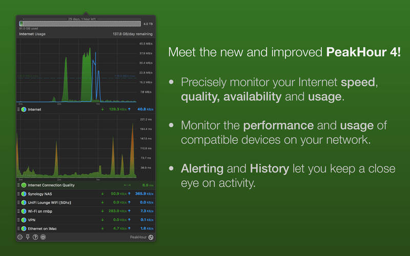 PeakHour is a beautiful, real-time network-traffic visualizer that lives in your menu bar. It provides an instant view of your Internet or WiFi activity in real-time. PeakHour is great for monitoring your Internet or WiFi connection, and can help you determine how much bandwidth your computers and devices are using at any given time.