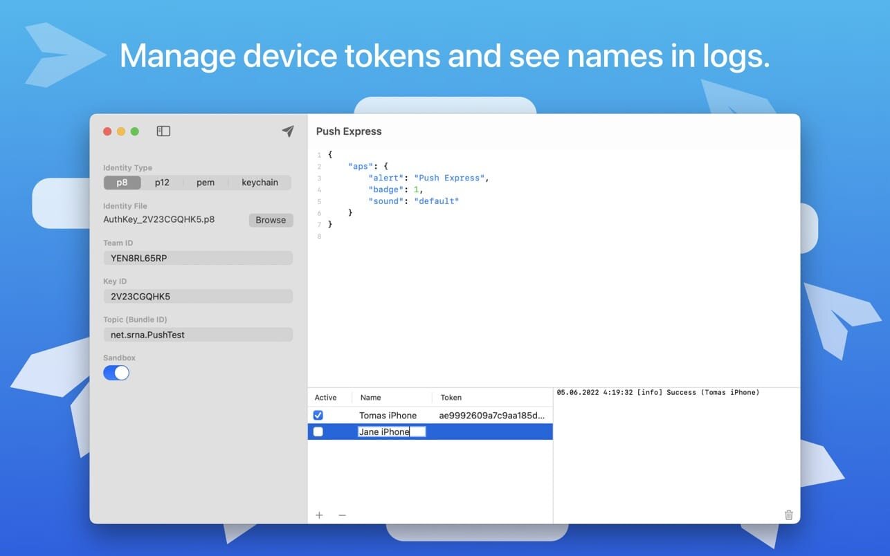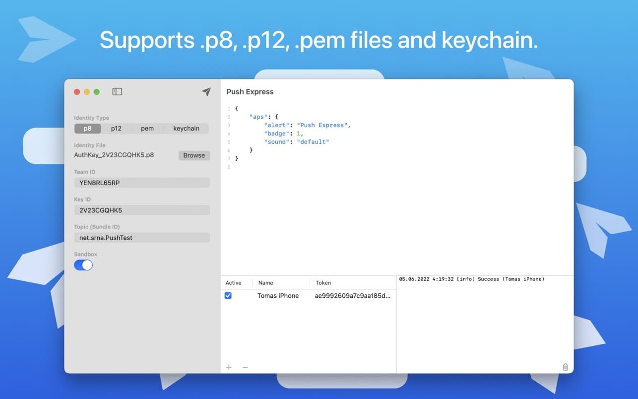 ApplicationsDeveloper tools Push Express 1.2 by mac torrent December 9, 2022 December 9, 2022 ( Push Express 1.2 )Loading... Download Powerful Push Notifications testing tool for developers. Supports all signing identity formats (p8, p12, pem, keychain). Good looking UI so you want to use it every day. Supports all of known signing identity configurations Newest P8 with JWT token P12 exported certificate PEM Keychain-loaded from your keychain Well-designed device token management with device names and a request log using these names, so you have a good overview of which device received the notification successfully and which not. You can also activate/deactivate a device in the list, so you don’t have to reenter any previous token after it was removed from testing. A good amount of work was put in into creating understandable error messages in case the notification cannot be sent, so even beginners know quickly what’s happened. User’s session is persistent, so you don’t have to worry about re-entering all the data upon new run or creating a list of devices What’s New: Version 1.2 In this version we start to kindly ask you to rate and review Push Express. Just once per version and maximum of 3 times a year. Compatibility: macOS 11.1 or later. Mac App Store https://apps.apple.com/app/push-express/id1565596370 Screenshots Name: Push Express 1.2 MAS [HCiSO]_Mactorrents.is.dmg Size: 2.5 MB Files Push Express 1.2 MAS [HCiSO]_ Mactorrents.is.dmg[2.5 MB] Download Related Posts:NCH Express Accounts Plus 10.14Express Accounts Plus 11.01Express Invoice Plus 11.05NCH Express Scribe Pro 13.00 Download ExpressPush 0 comment TwitterRedditEmail mac torrent MacTorrent - Torrents in Mac. Free Apps, Games & Plugins. Apple Final Cut Pro & Logic Pro X, Adobe Photoshop, Microsoft Office, Pixel Film Studios, previous post WebShot 1.2 next post Countdown 2.1