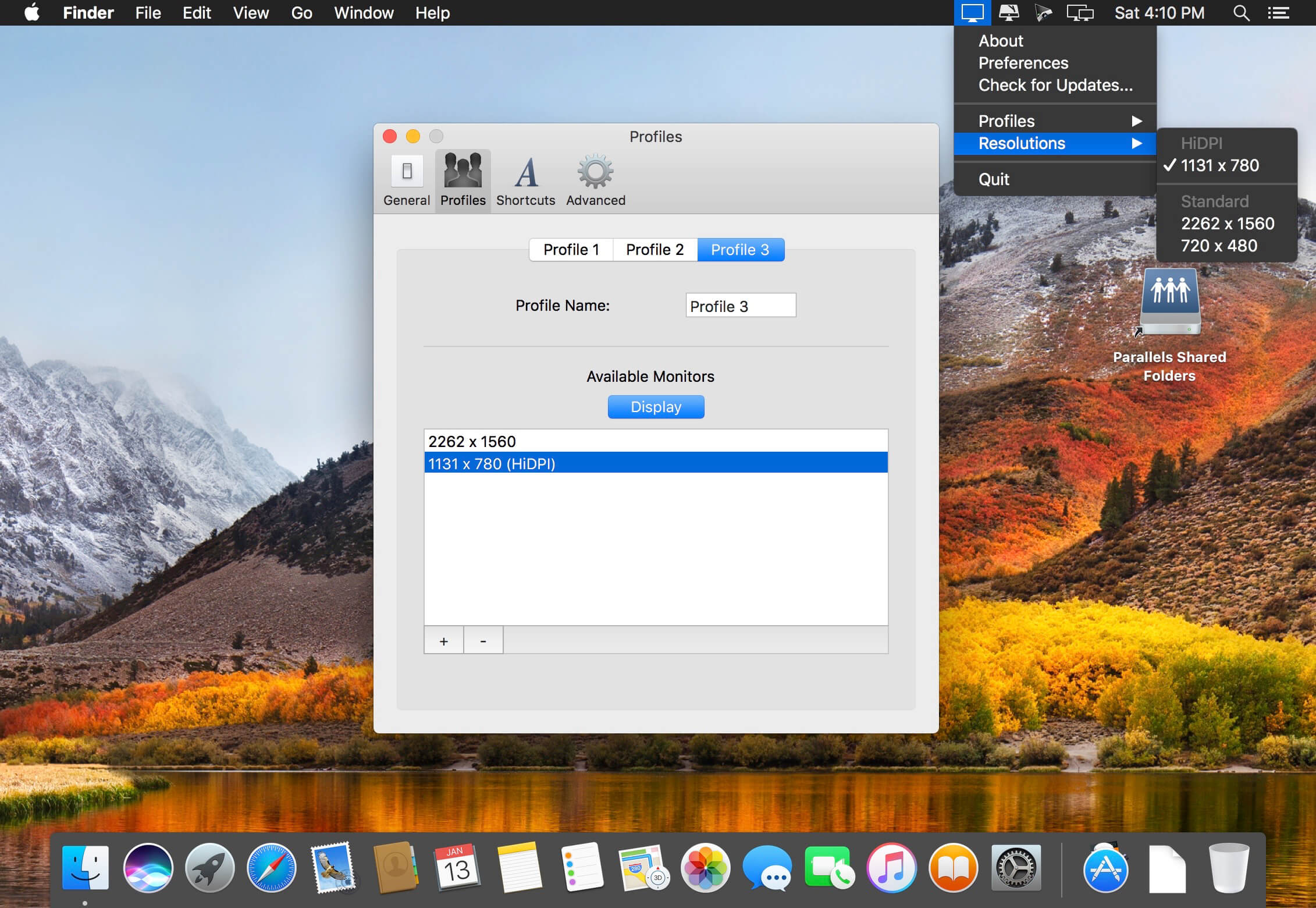 QuickRes is the quickest and easiest way to switch between screen resolutions on your Mac. With the MacBook Pro with Retina Display, you can set your resolution all the way up to an extreme 3840 x 2400! With other Macs, you can set your resolutions to things you’ve never seen before, including a HiDPI mode, which is as close you can get to a Retina Display on a standard computer.