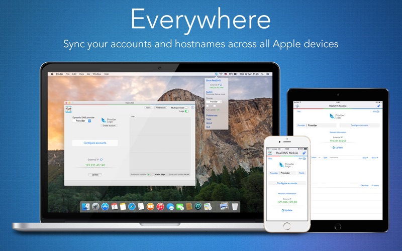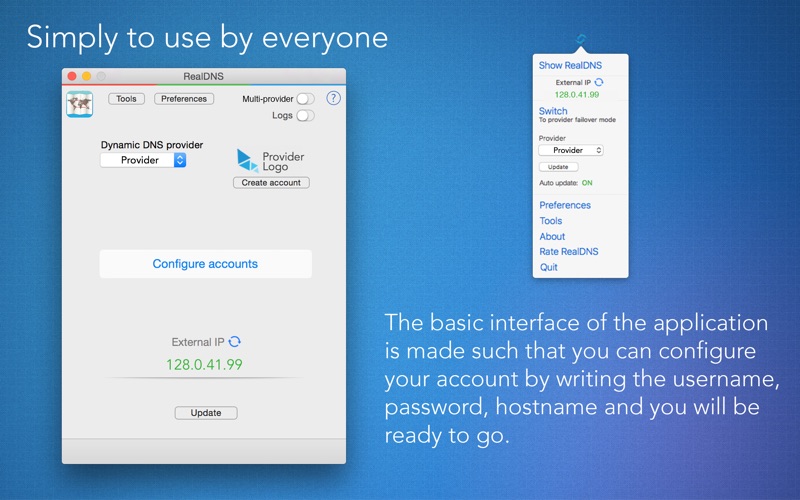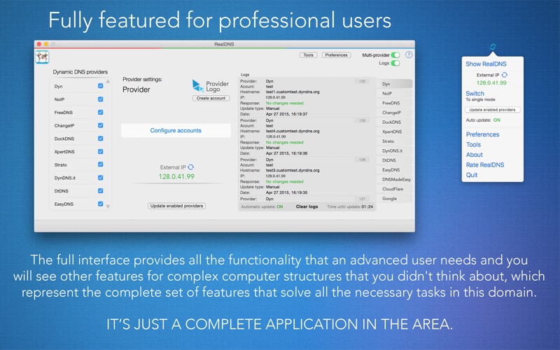 FreeMacRealDNSUtilities RealDNS 7.4.3 by mac torrents November 4, 2019 November 4, 2019 ( RealDNS 7.4.3 )Loading... Download Name RealDNS 7.4.3 HCISO mac-torrents.net.zip Size 17.39 MB Created on 2019-11-05 00:11:44 Hash e7967769c1d9582a4ea19636cb56ad71bb0d4217 Files RealDNS 7.4.3 HCISO mac-torrents.net.zip (17.39 MB) Download Download RealDNS 7.4.3 The best dynamic DNS update client on App Store with support IPv4 and IPv6. Also available on iOS, with iCloud syncronization. RealDNS updates 18 dynamic DNS providers: Dyn, NoIP, FreeDNS, ChangeIP, DuckDNS, XpertDNS, Strato, DynDNS.it, DtDNS, EasyDNS, DNS Made Easy, CloudFlare, Google Domains, Namecheap, Hurricane Electric, Loopia, OpenDNS, GoDaddy. RealDNS is an application that updates your hostnames with the latest IP address of your computer assuring that you will always have an updated hostname allowing you to connect to your computer from everywhere. The IP address, which will be used to perform the hostname update, can be: External Gateway Local Manually defined The application has an initial easy to use interface for every user but behind it the application contains powerful tools for professionals. Provider failover- this option allow you to make hostname updates to multiple providers at the same time, so in case a provider will be down your IP address will be saved to the other enabled providers assuring that you will always have a hostname updated with your latest IP address. Internal failover- if the interface assigned to your hostname is not available the application will get the IP address of any available network interface and perform an update with that IP, thus maintaining a connection to your device, with two failover types. Multiple account, multiple hostnames, multiple IP sources- Use the IP address of any available interface in your system and assign it to any hostname from any account. Every hostname can have his own IP source. Tools- perform Show IP Ping Who is Dig Geo IP on any hostname iCloud synchronization- sync your accounts and hostnames between Mac OS X and iOS (available with Mac OS X Yosemite and iOS 8). Update after wake-up- performs an update at wake-up if the time spent in sleep is exceeded the automatic update time interval. Logs- all your actions and the dynamic DNS provider responses will be displayed on the log view. IP History- a log is kept with all your successful IP updates made by the application. Manual update- a manual update can be performed at any moment. Run at login- the application can be set to run at login so that hostnames will be always updated in the background with no user interaction, even if the computer restarts. Don’t allow computer to enter sleep- The application won’t allow the computer to enter sleep when is locked or idle so it can update hostnames in background Help- complete help for all the application functions, and more. The application respects the following principles: “easy for everybody, complete for professionals”. Information Compatibility OS X 10.10 or later, 64-bit processor Languages English Web Site Developer Website | Mac App Store What’s New in RealDNS 7.4.3 Fixes some compatibility issues with macOS Catalina. Screenshots Download RealDNS 0 comment TwitterRedditEmail mac torrents Mac Torrents - Torrents for Mac. Free Apps, Games & Plugins. Apple Final Cut Pro & Logic Pro X, Adobe Photoshop, Microsoft Office, Pixel Film Studios, previous post Compress PDF 2.0.0 next post Screenshot Editor 2.3.3
