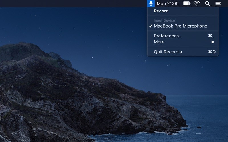 Recordia lets you record audio directly from the menu bar or with a global keyboard shortcut.