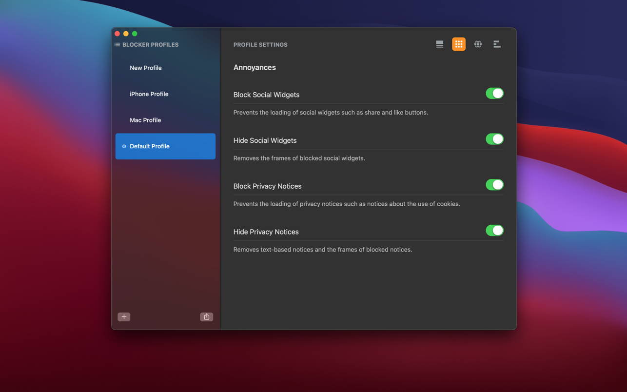 - Comprehensive and optimized built-in rules to block different types of ads, pop-ups, trackers, social widgets, and privacy banners