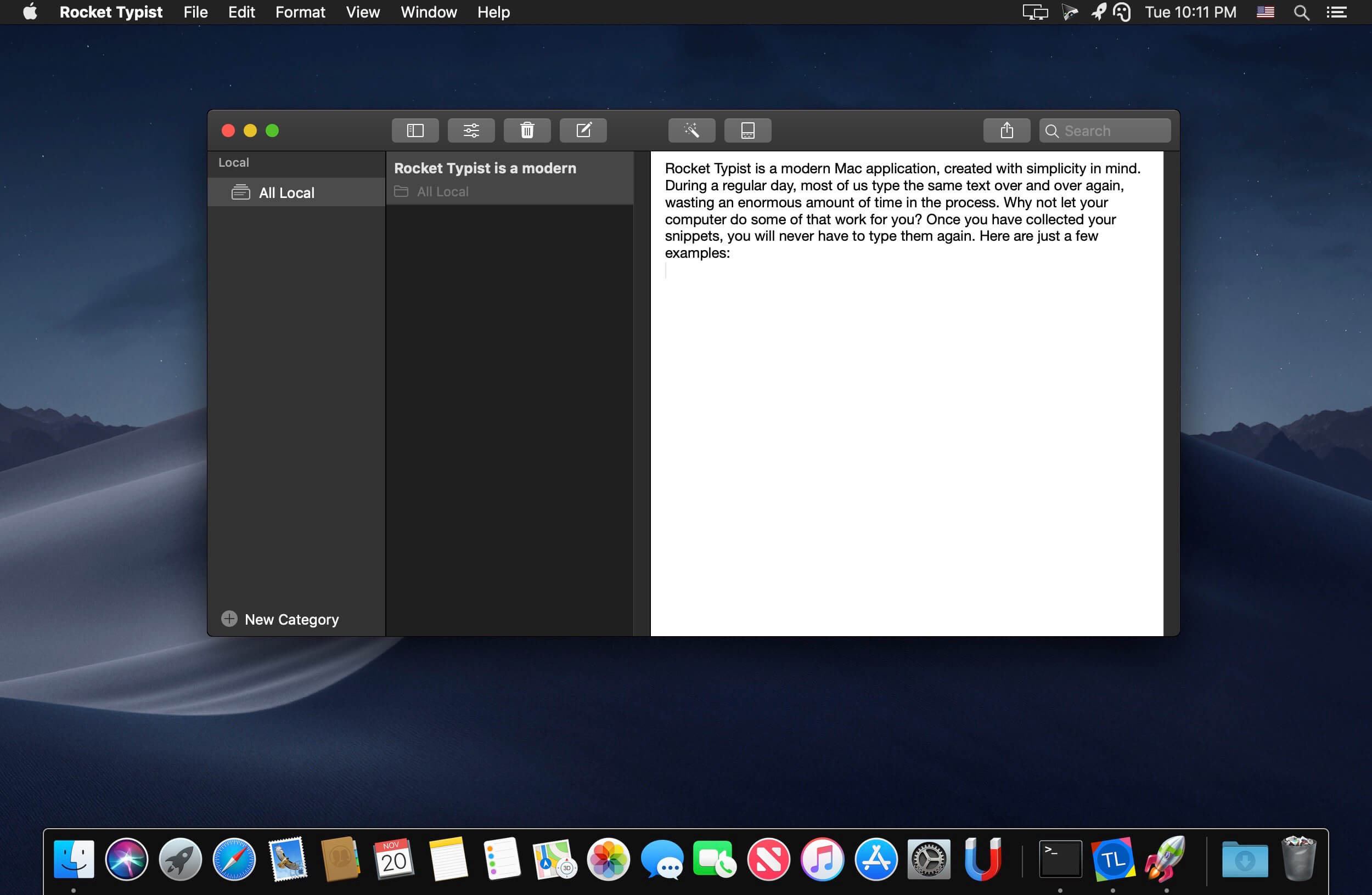 Rocket Typist is a modern Mac application, created with simplicity in mind. During a regular day, most of us type the same text over and over again, wasting an enormous amount of time in the process. Why not let your computer do some of that work for you? Once you have collected your snippets, you will never have to type them again. Here are just a few examples: