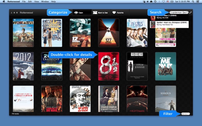 Rottenwood gives you a centralized location for listing the movies you’ve seen or want to see, to mark them as favorites, or even to make notes about them, all in an attractive interface complete with advanced search features.