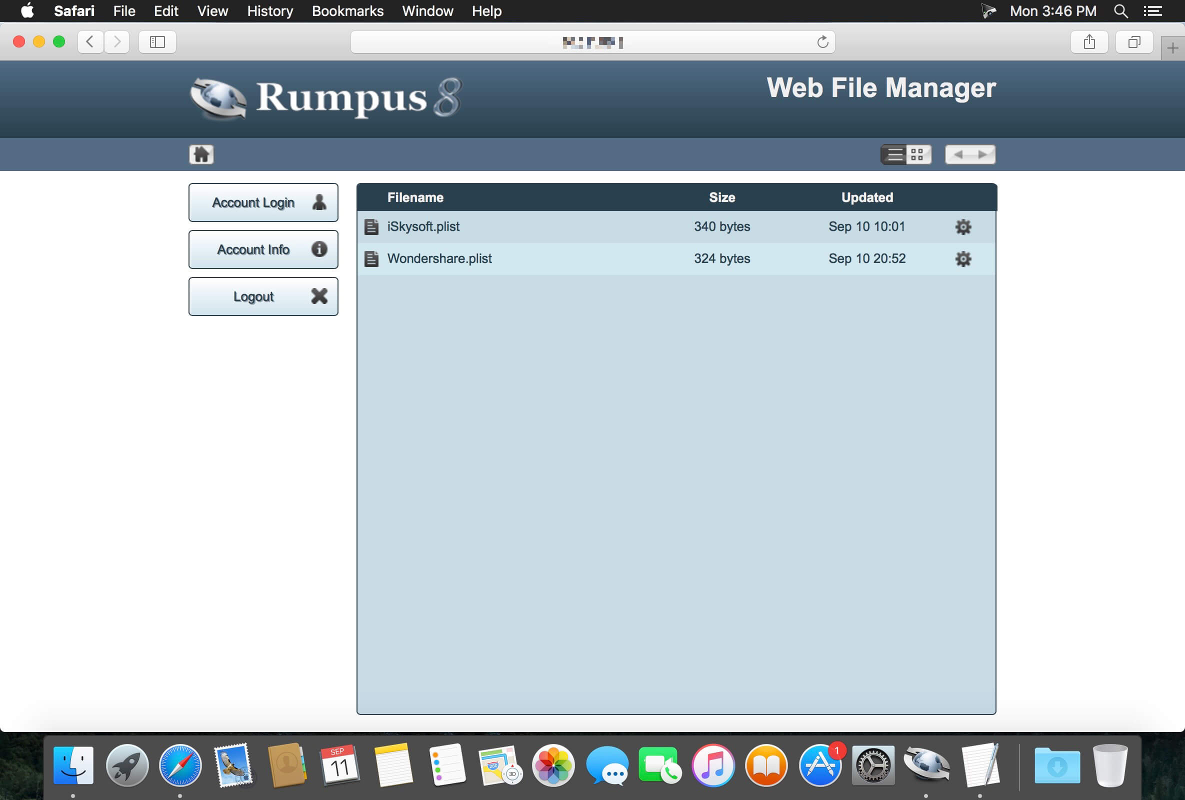 Rumpus turns any Mac into a complete file transfer server. Send files to outside people, or let clients upload files directly to your network in a secure, controlled environment. Rumpus supports FTP, WebDAV, and a fully customizable Web file transfer interface and makes it easy to securely exchange files with anyone, anywhere.