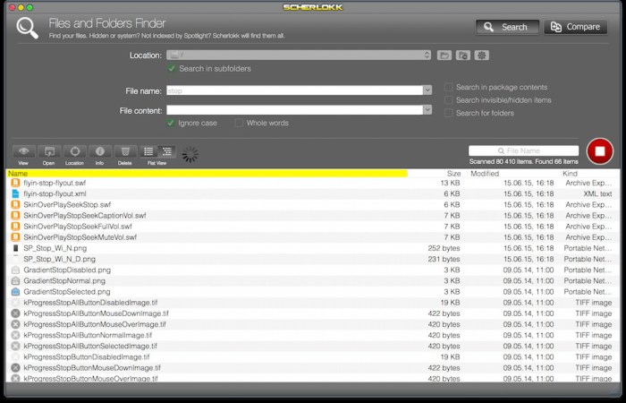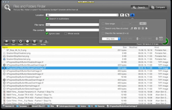 - Clean and easy to use interface. Which files can Scherlokk find? Because Scherlokk is not based upon the Spotlight’s index, and has its own, powerful search engine, it will find every single file on any accessible volume in your computer.
