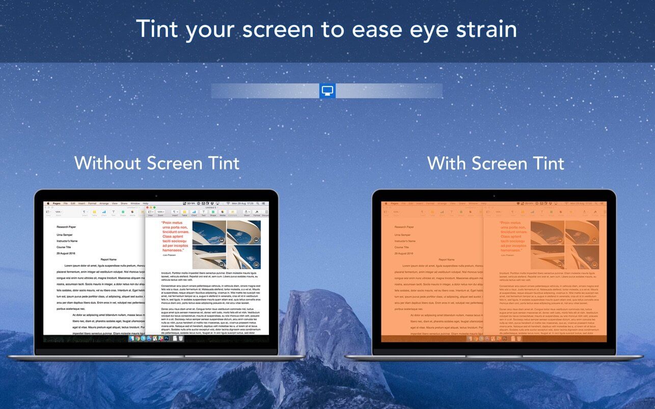 ApplicationApplications Screen Tint 1.0.7 March 24, 2026 ( Screen Tint 1.0.7 )Loading... Download Screen Tint is a handy utility app that is designed to reduce the brightness of your Mac’s screen, proving particularly useful for users with sensitive eyes and for those that wish to use their Mac in a darker environment, but find that their screen’s brightness to be too harsh. We recommend to use a warm tint when working at night and a cool tint for working in artificial light. KEY FEATURES: Choose between 7 primary tint colors, with the ability to also configure any tint colour of your choice using the colour palette Ability to toggle the intensity of the tint colour using the ‘color intensity’ slider Enable the app to run between a specified time schedule automatically Quickly be able to enable/disable the app from the menubar itself Tint not only your Mac’s screen as the main display, but also attached external displays BENEFITS: Perfect for users wanting to use their Mac’s in the night/dark environments Useful for users that have sensitive eyes and find the regular brightness levels of Macs to be too high Give your screen a unique colored tint that’s both good for your eyes, as well as visually appealing Compatibility: macOS 11.5 or later Homepage https://geo.itunes.apple.com/app/id1146529225 Screenshots Name: Screen_Tint_1.0.7.dmg Size: 10 MB Files Screen_Tint_1.0.7.dmg [10 MB] Download Torrent Related Posts:Screen Studio for Mac 2.22.3Screen Wonders 2.2.1Screen Recorder by Omi 1.3.8Screen Wonders 2.2.0 Download 1.0.7ScreenTint 0 comment TwitterRedditEmail mac torrent MacTorrent - Torrents in Mac. Free Apps, Games & Plugins. Apple Final Cut Pro & Logic Pro X, Adobe Photoshop, Microsoft Office, Pixel Film Studios, previous post Window Focus 1.0.8 (18.1) next post Mellel 6.6.5