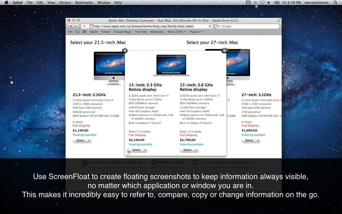 ScreenFloat allows you to create screenshots which float above all other windows so that information is always readily available.