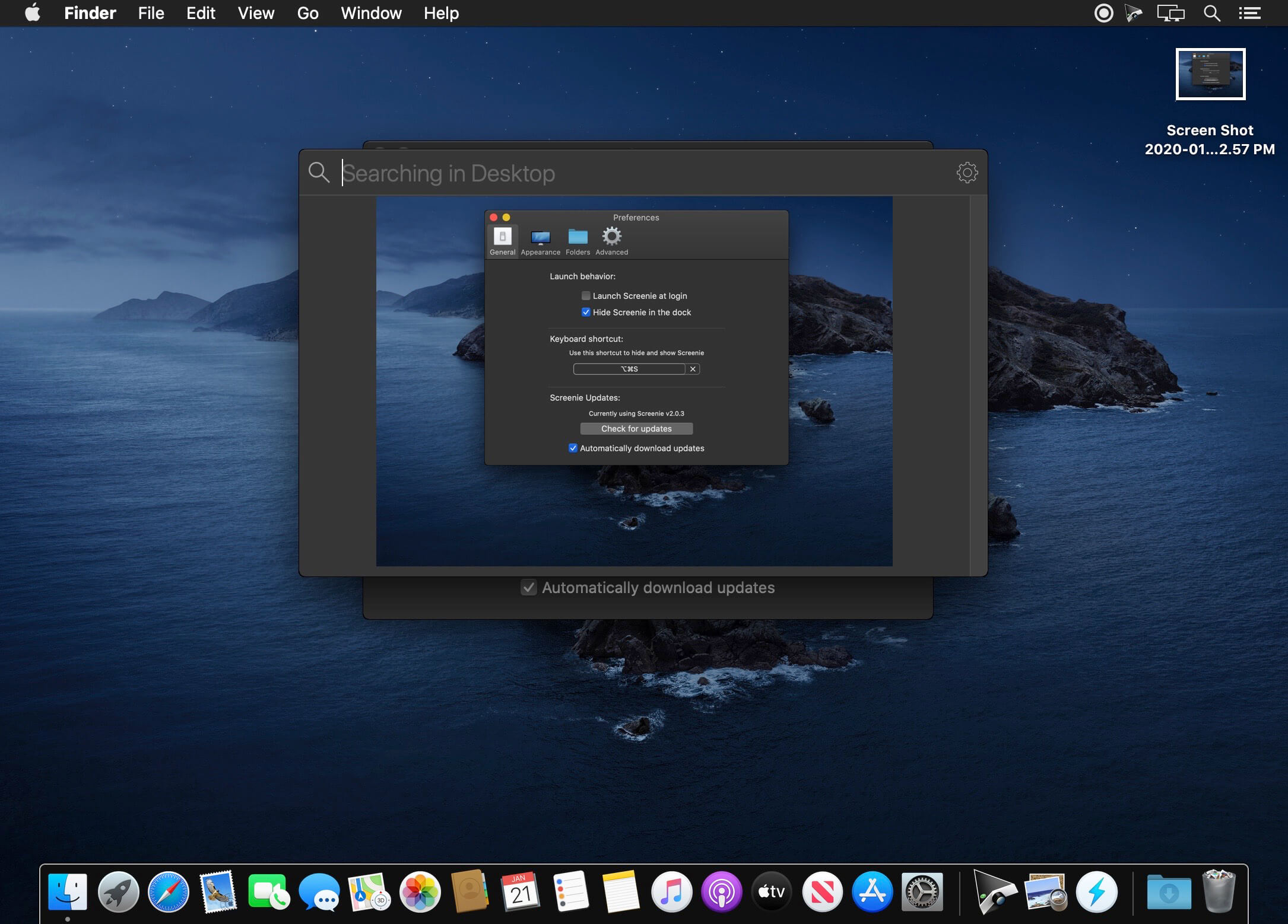 Screenie is the screenshot manager Apple forgot. You can drag screenshots right from your menu bar, or browse all of them from a convent drop down. Change the default location of screenshots, default file type, and even set a shortcut to copy the last image to your clipboard!
