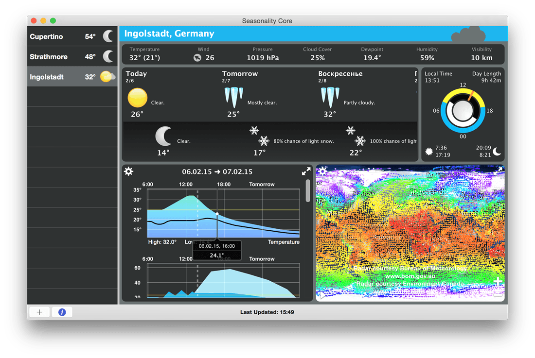 ApplicationsCoreSeasonalityWeather Seasonality Core 2.7.1 by mac torrent August 27, 2020 August 27, 2020 ( Seasonality Core 2.7.1 )Loading... Download Seasonality Core is the complete weather center for your Mac. View weather at any of the 34,000 built-in locations in more than 200 countries, or add your own custom weather location to view even more precise data. Seasonality gives you an accurate 7 day forecast, graphs of past weather conditions, a custom satellite/radar image, and much more. Seasonality Core’s graphs are excellent at showing how weather conditions are changing over days, months, or even years. Seasonality Core will automatically collect and store weather data indefinitely. The custom satellite/radar image gives users the option to adjust opacity of both overlays, show the latest North American surface analysis, and view the global wind flow with Particle Mode. Seasonality Core has a solid foundation from being in development for almost 10 years. We always welcome feedback, and have made countless improvements to the software over the years based on user suggestions. If Seasonality Core is missing something, we want to hear about it! Send your feedback to our support email. What we’re working on: Higher resolution radar within the US Improved radar coverage outside the US Supporting personal weather stations Weather watches and warnings An even more flexible interface Compatibility: OS X 10.8 or later, 64-bit processor Homepage https://getseasonality.com/core Screenshots Name: Seasonality_Core_2.7.1__TNT_Mactorrents.io.dmg Size: 9 MB Files Seasonality_Core_2.7.1__TNT_Mactorrents.io.dmg[9 MB] Download Download 0 comment TwitterRedditEmail mac torrent MacTorrent - Torrents in Mac. Free Apps, Games & Plugins. Apple Final Cut Pro & Logic Pro X, Adobe Photoshop, Microsoft Office, Pixel Film Studios, previous post BusyCal 3.10.3 (401044) next post SyncSettings 1.2.4