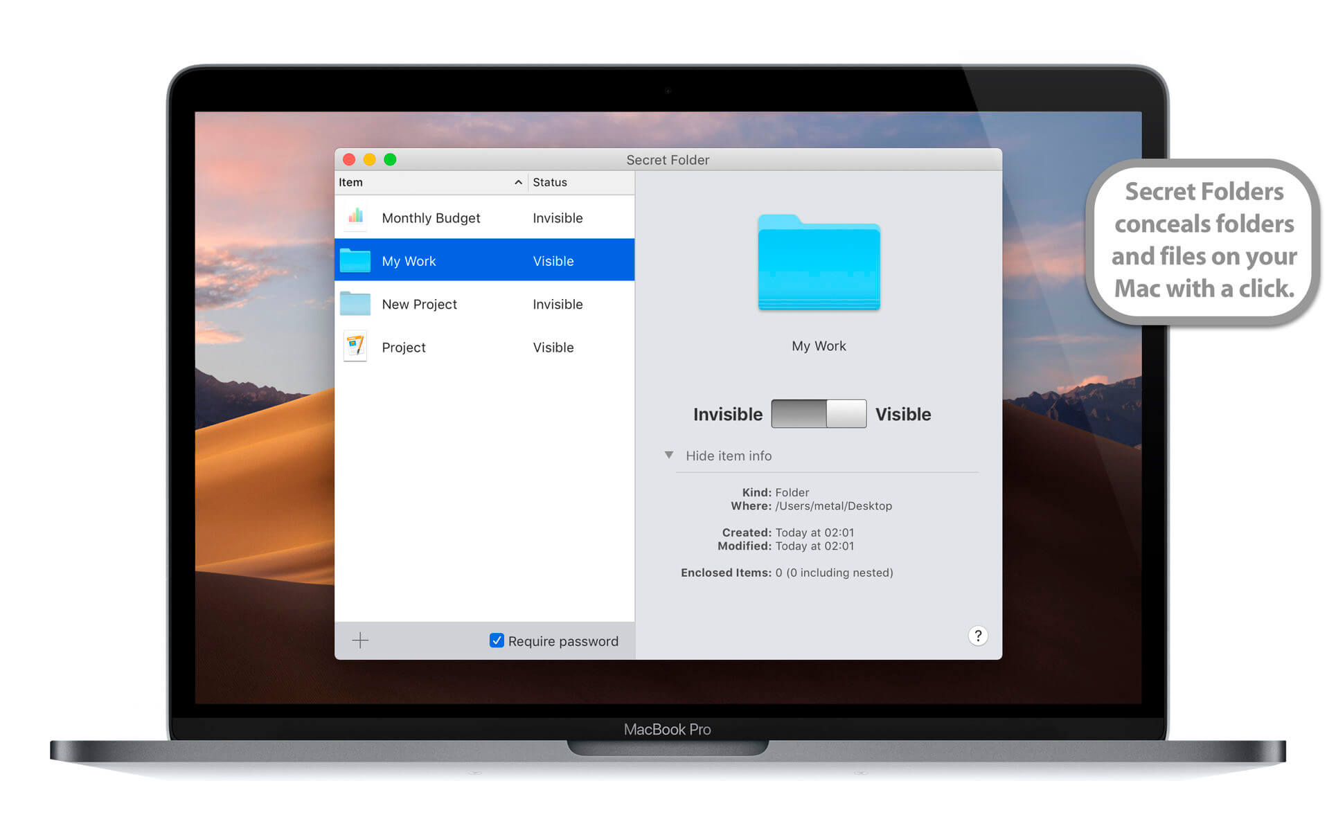 ApplicationsFolderProSecretUtilities Secret Folder Pro 10.2 by mac torrent December 19, 2020 December 19, 2020 ( Secret Folder Pro 10.2 )Loading... Download The most simple and straightforward method to protect a file or a folder. Secret Folder allow you to build a list of file and folders, which you may turn visible or invisible with a simple click. In addition, the application launch can be password-protected. This protection system is based on the principle that no person will attempt to open a file he/she cannot see or knows about. Secret Folder constitutes the perfect solution if you wish to prevent occasional users of your Mac to view, open, or change files or documents while browsing the contents of your hard drive. Notes about updating from a very old version Don’t you see the file’s list after updating from a very old version? Don’t worry, the solution is easy, please contact our support. Notes about security This app uses the standard functionality of the operating system to make folders and files invisible. Programmers and experienced users could gain access to a folder made invisible and there are some applications that let you open invisible files or files contained in a folder made invisible. Whether you need advanced levels for protecting your data, there are other ways. To learn more about Protecting information on removable media open Finder’s Help. What’s New: Version 10.2 Release notes were unavailable when this listing was updated Compatibility: OS X 10.8 + Homepage https://www.apimac.com/mac/secretfolder/ Screenshots Name: Secret_Folder_10.2__TNT_Mactorrents.io.dmg Size: 5.64 MB Files Secret_Folder_10.2__TNT_Mactorrents.io.dmg[5.64 MB] Download Related Posts:Secret Folder Pro 11.0Default Folder X 5.7.1 fixColor Folder Pro 3.5Default Folder X 5.7.2 Download 0 comment TwitterRedditEmail mac torrent MacTorrent - Torrents in Mac. Free Apps, Games & Plugins. Apple Final Cut Pro & Logic Pro X, Adobe Photoshop, Microsoft Office, Pixel Film Studios, previous post Postico 1.5.17 next post MacPilot 12.0.5